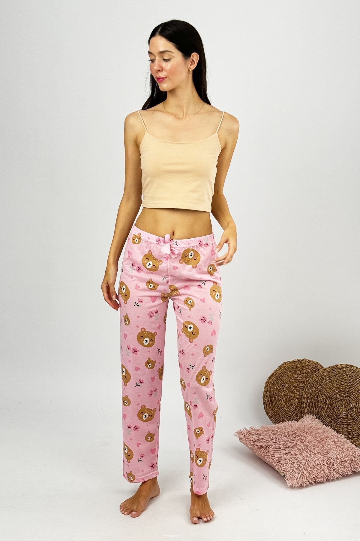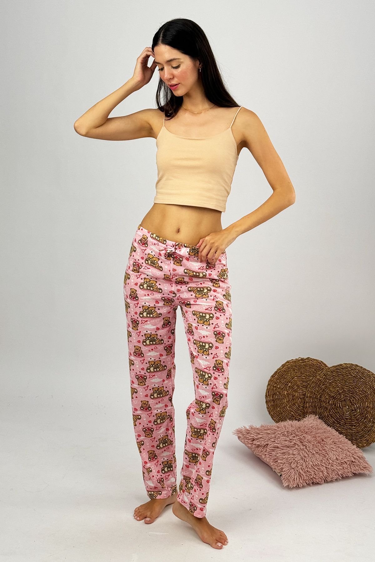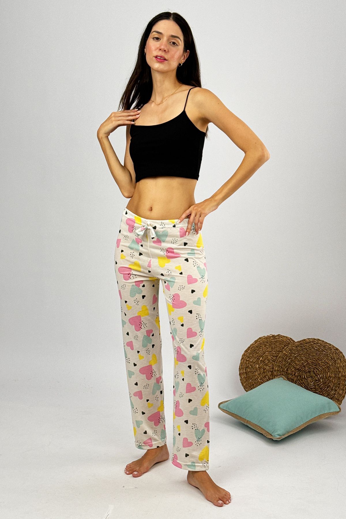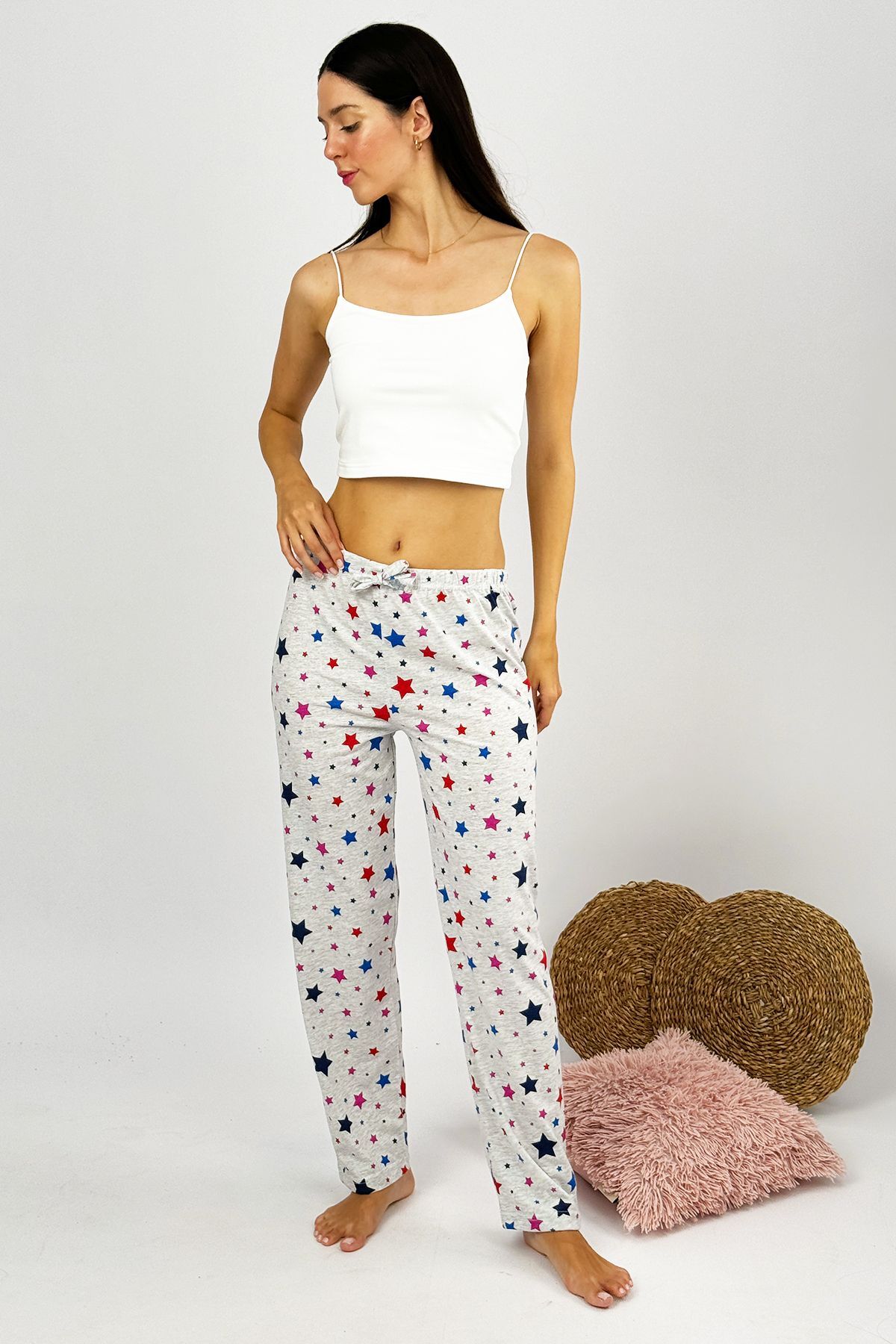 Kadın %100 Pamuk İnce Nefes Alan Kumaş Lastikli Bel Desenli Baskılı Pijama Altı