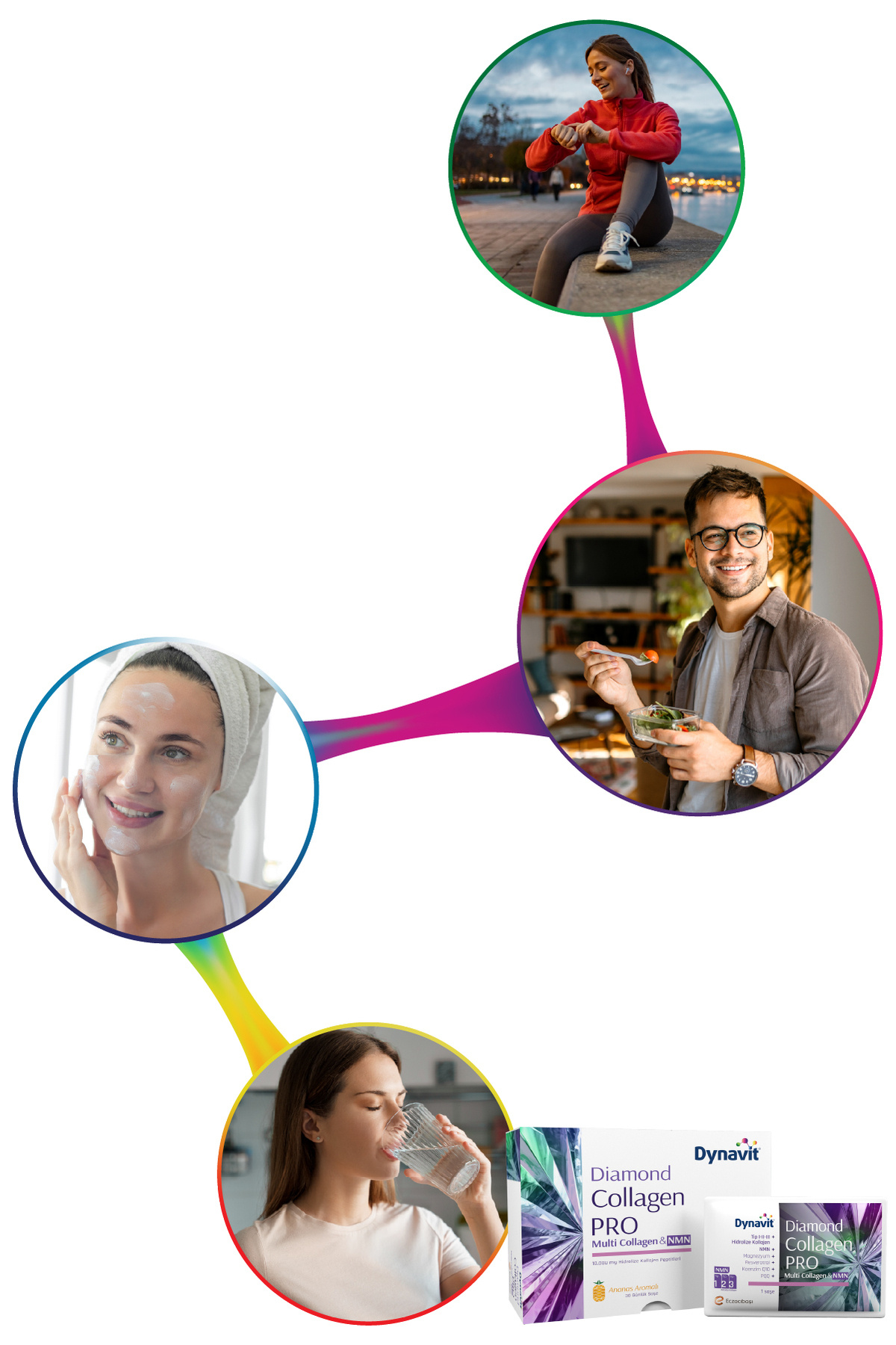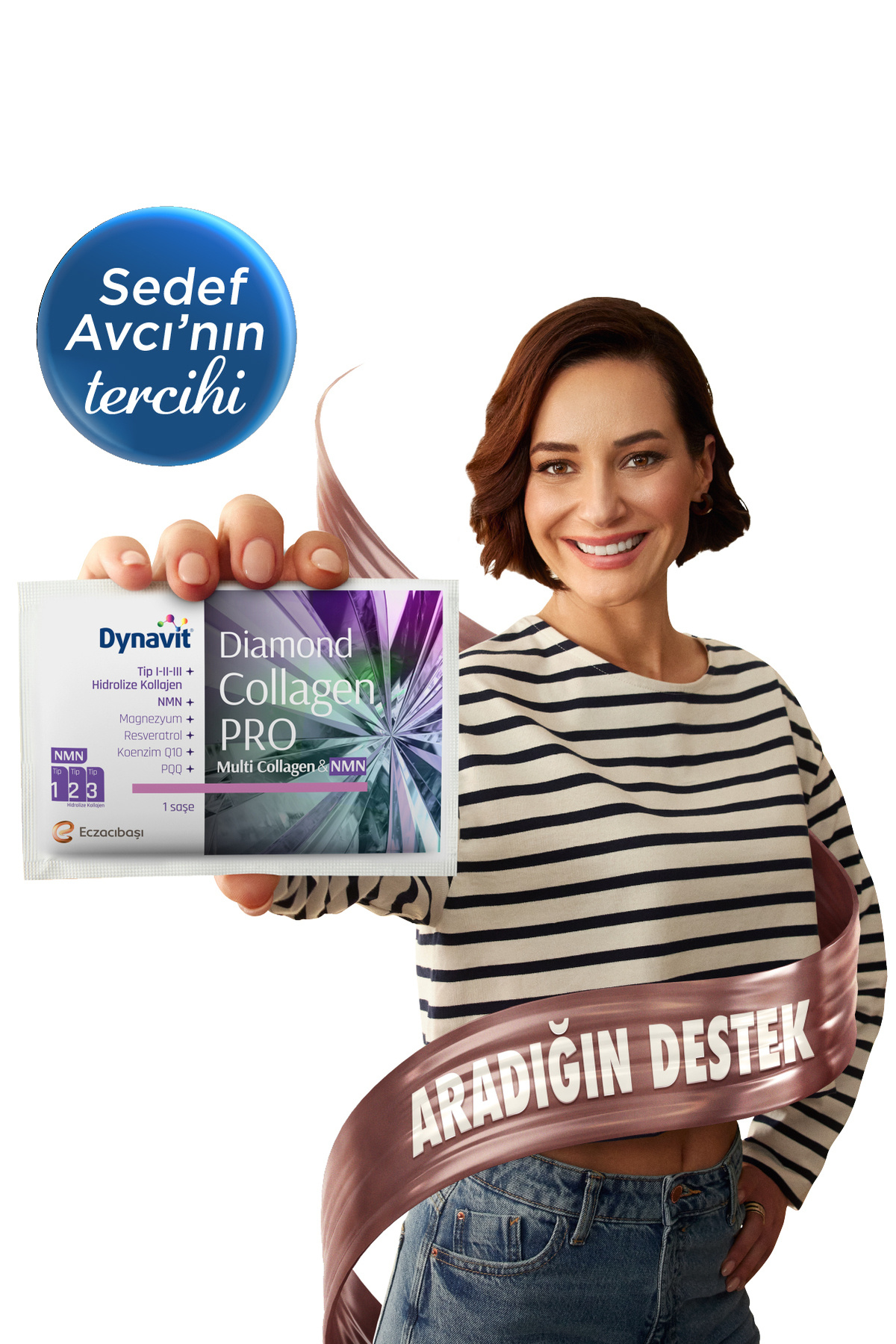 Dynavit Diamond Collagen PRO Multi Collagen: Tip I-II-III Hidrolize Kollajen, Koenzim Q10, Resveratrol ve Magnezyum içeren ananas aromalı toz takviye edici gıdadır.