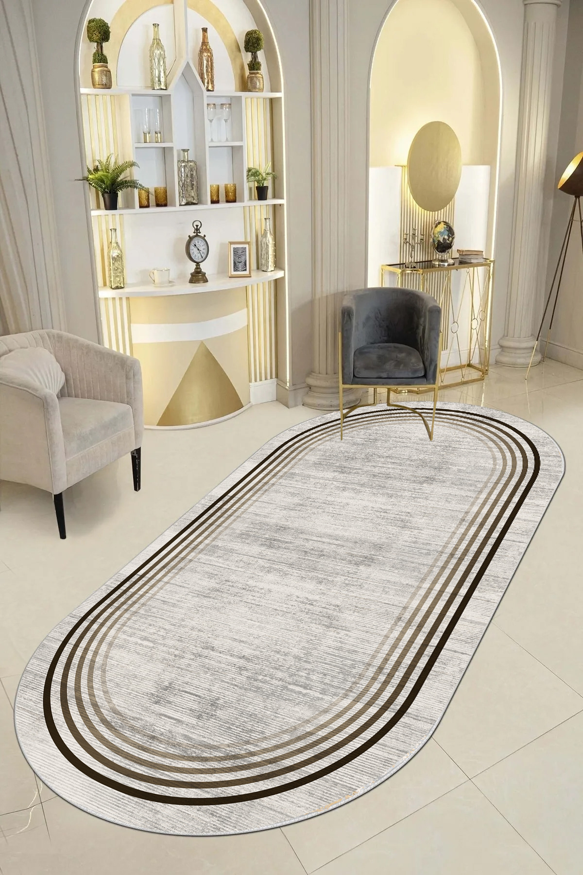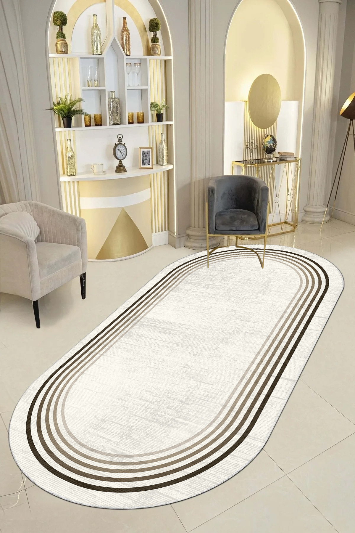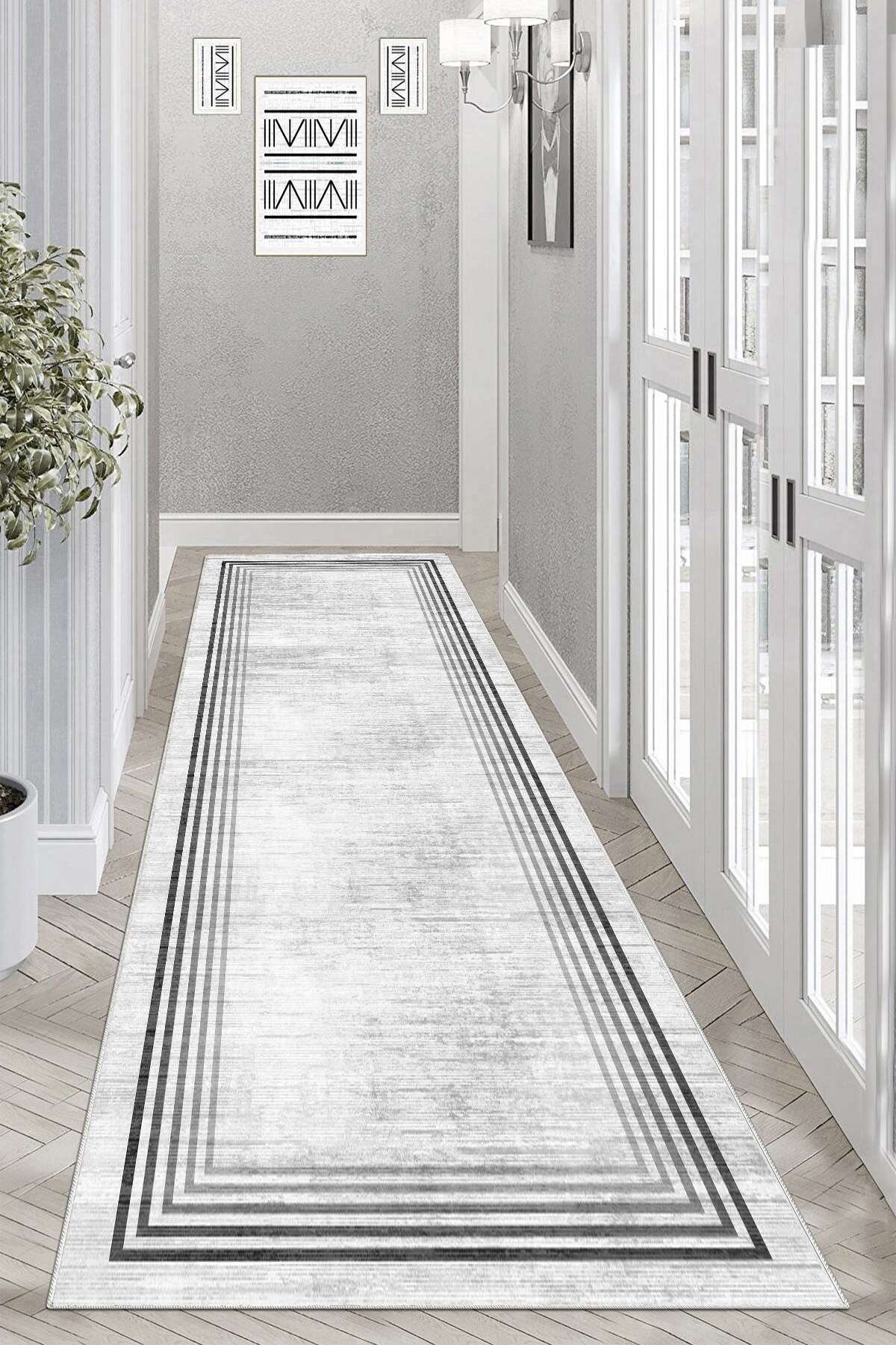 Modern tasarımıyla evinizin dekorasyonuna şıklık katan geometrik desenli yolluk, antre ve hol gibi alanlarda estetik bir görünüm sağlar