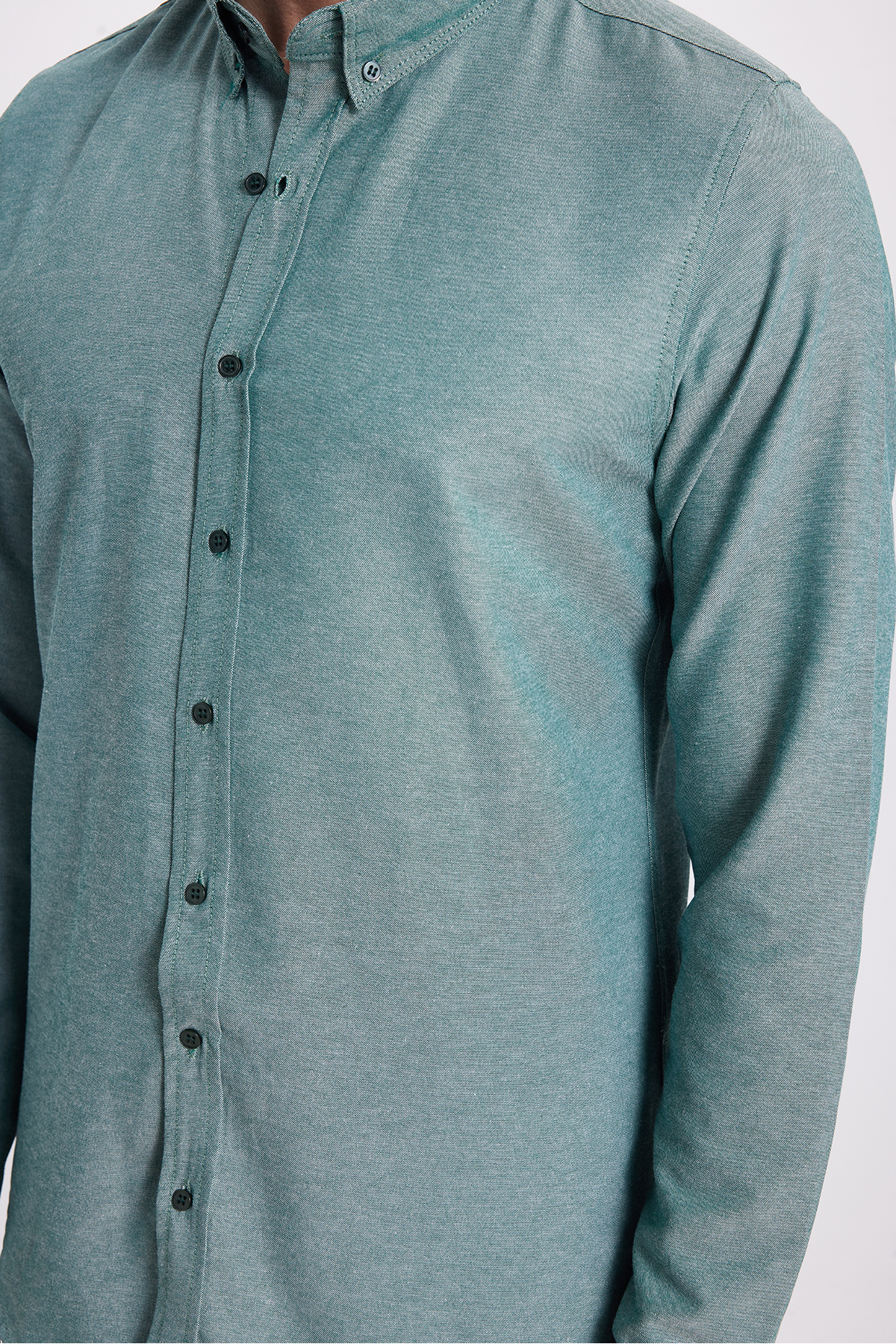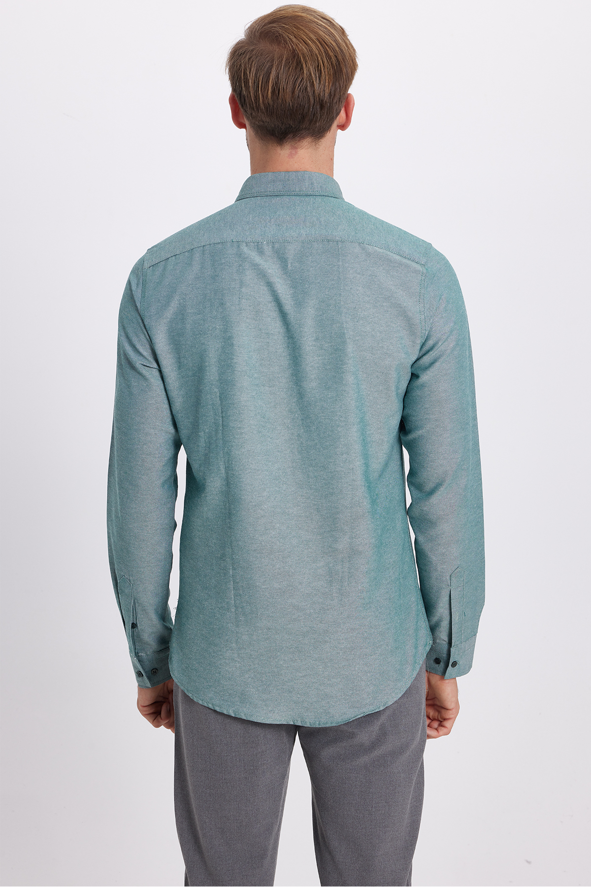 Erkek Slim Fit Dar Kesim Uzun Kollu Pamuklu Oxford Doku Kolay Ütü Yeşil Düğmeli Yaka Gömlek