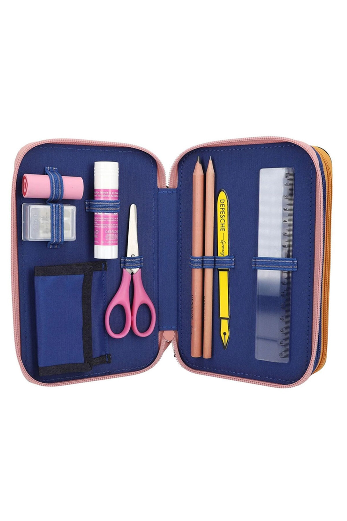 Üç ayrı bölme, 18 adet boya ve keçeli kalem, 2 adet kurşun kalem, kalemtıraş, silgi, cetvel, makas, prit ve küçük bir cırt cırtlı kese ile tamamen doldurulmuştur.