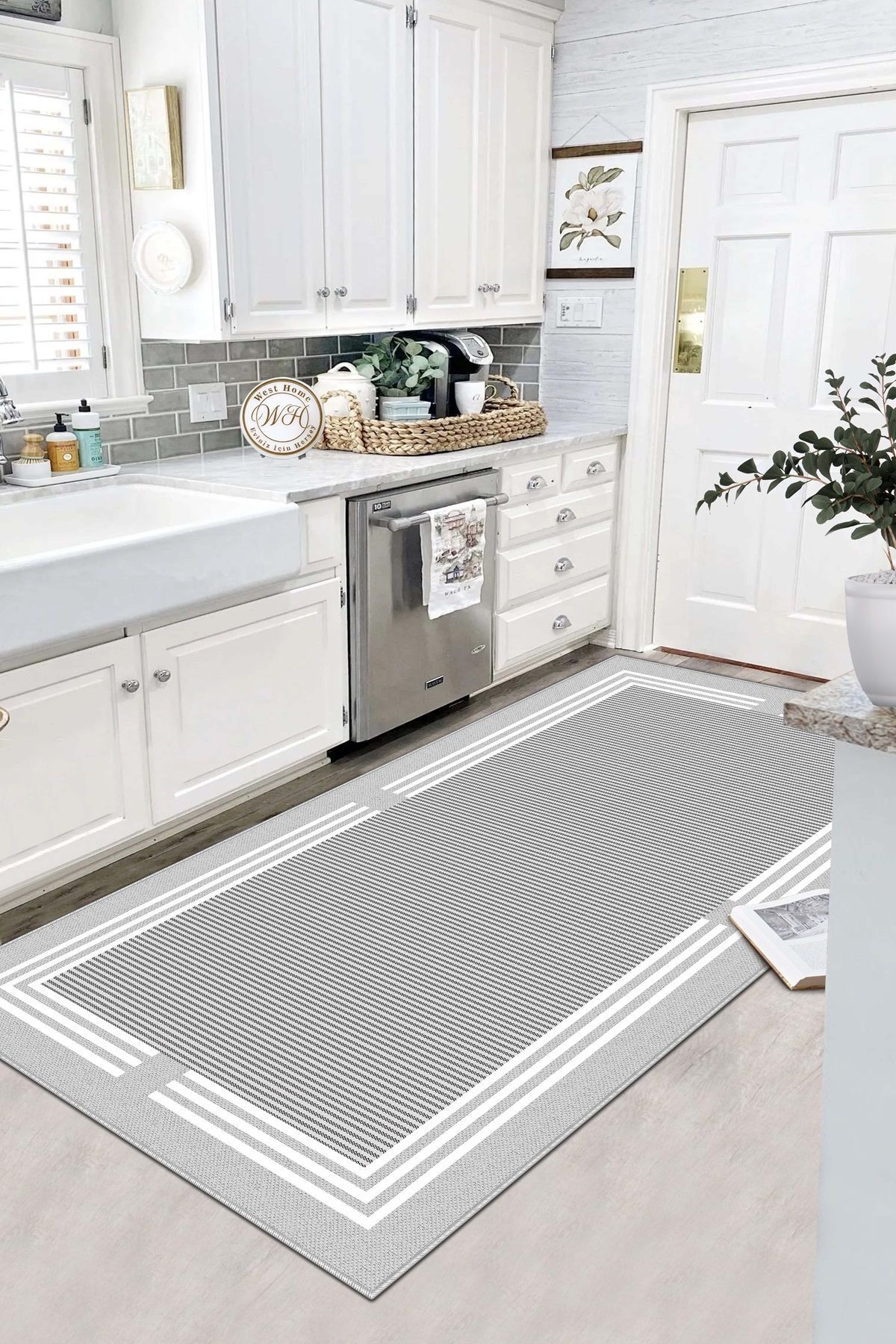 Makinede Yıkanabilir Kaymaz Taban Leke Tutmaz Gri Çizgili Salon Halısı Mutfak Halısı ve Yolluk