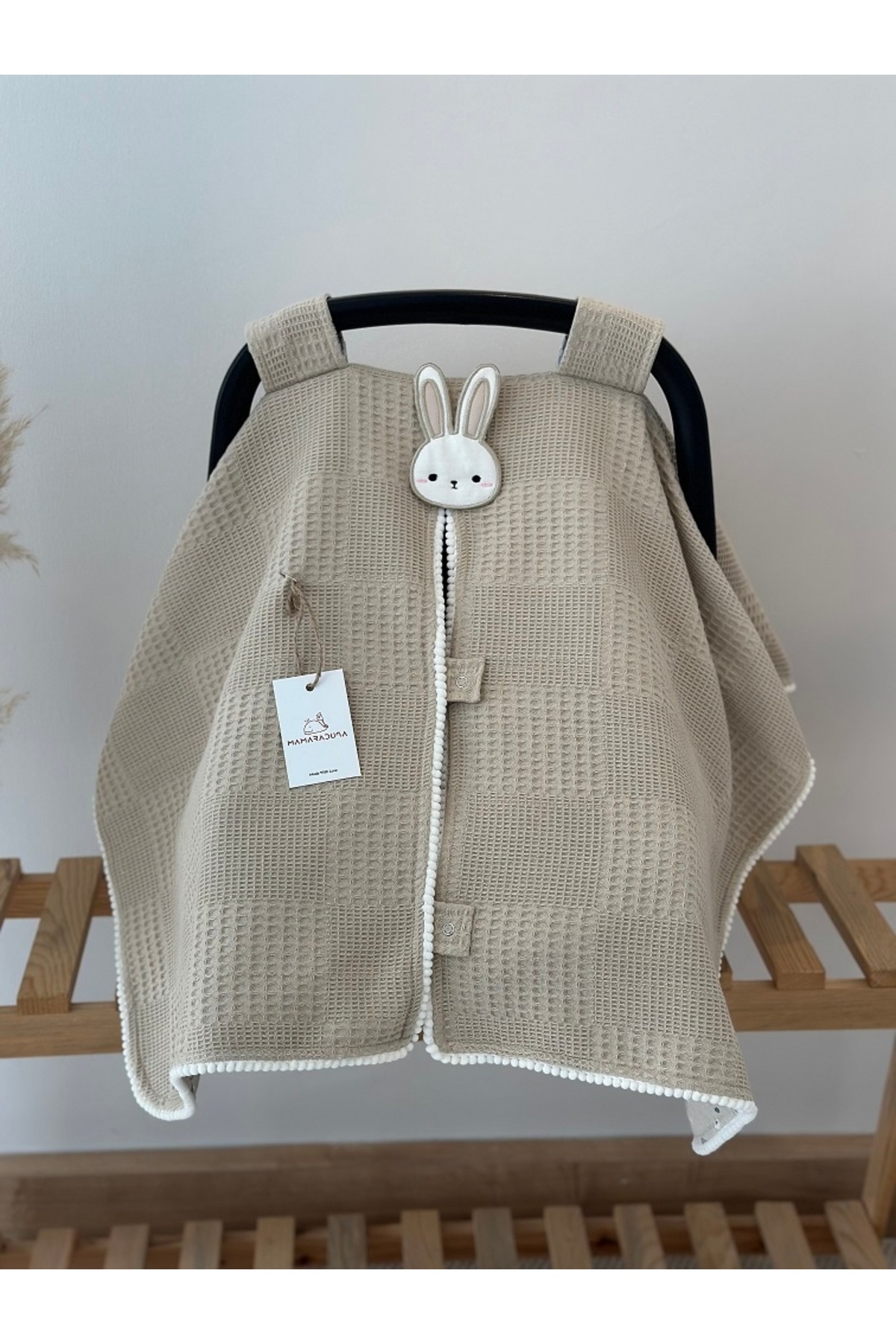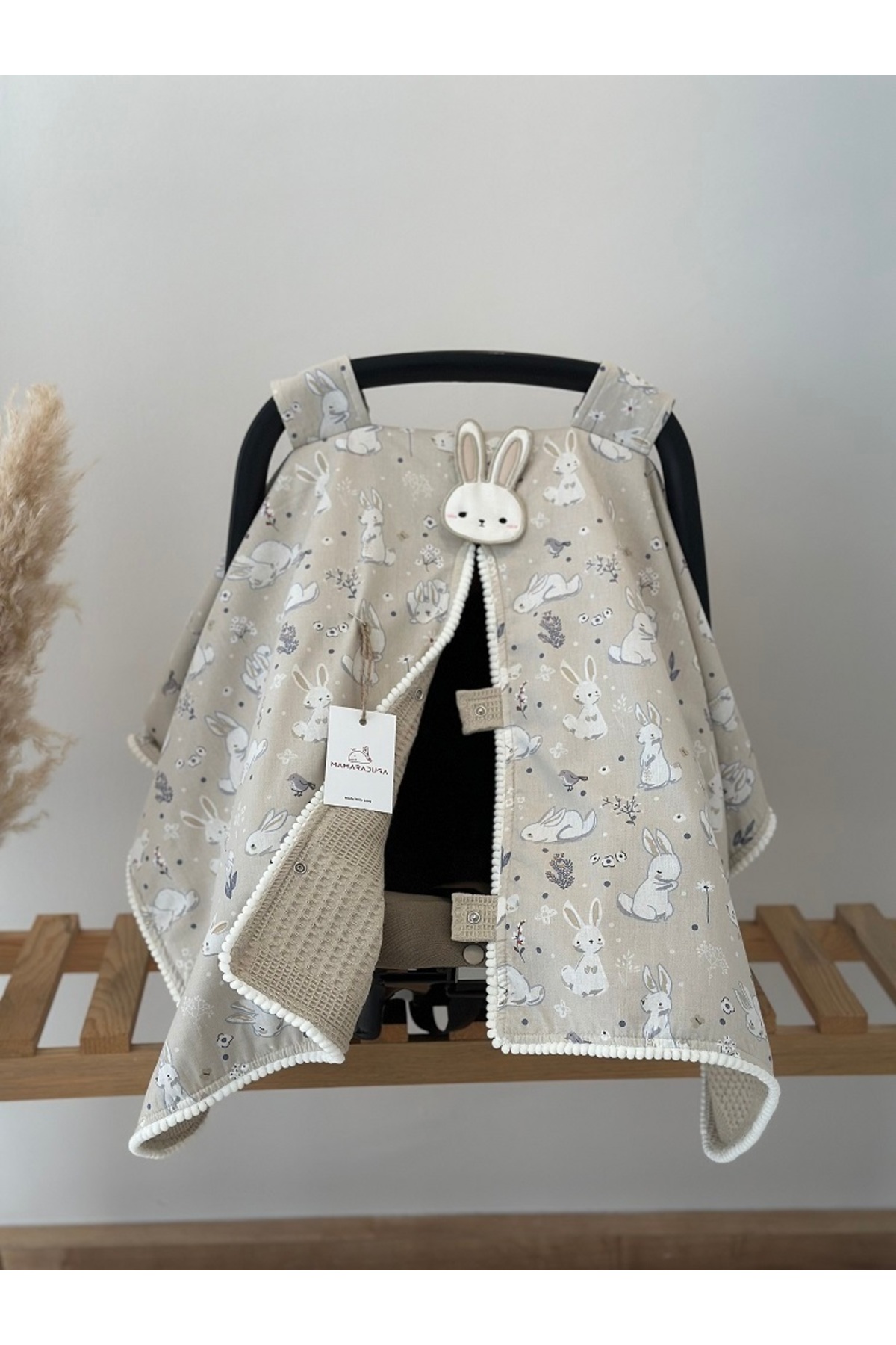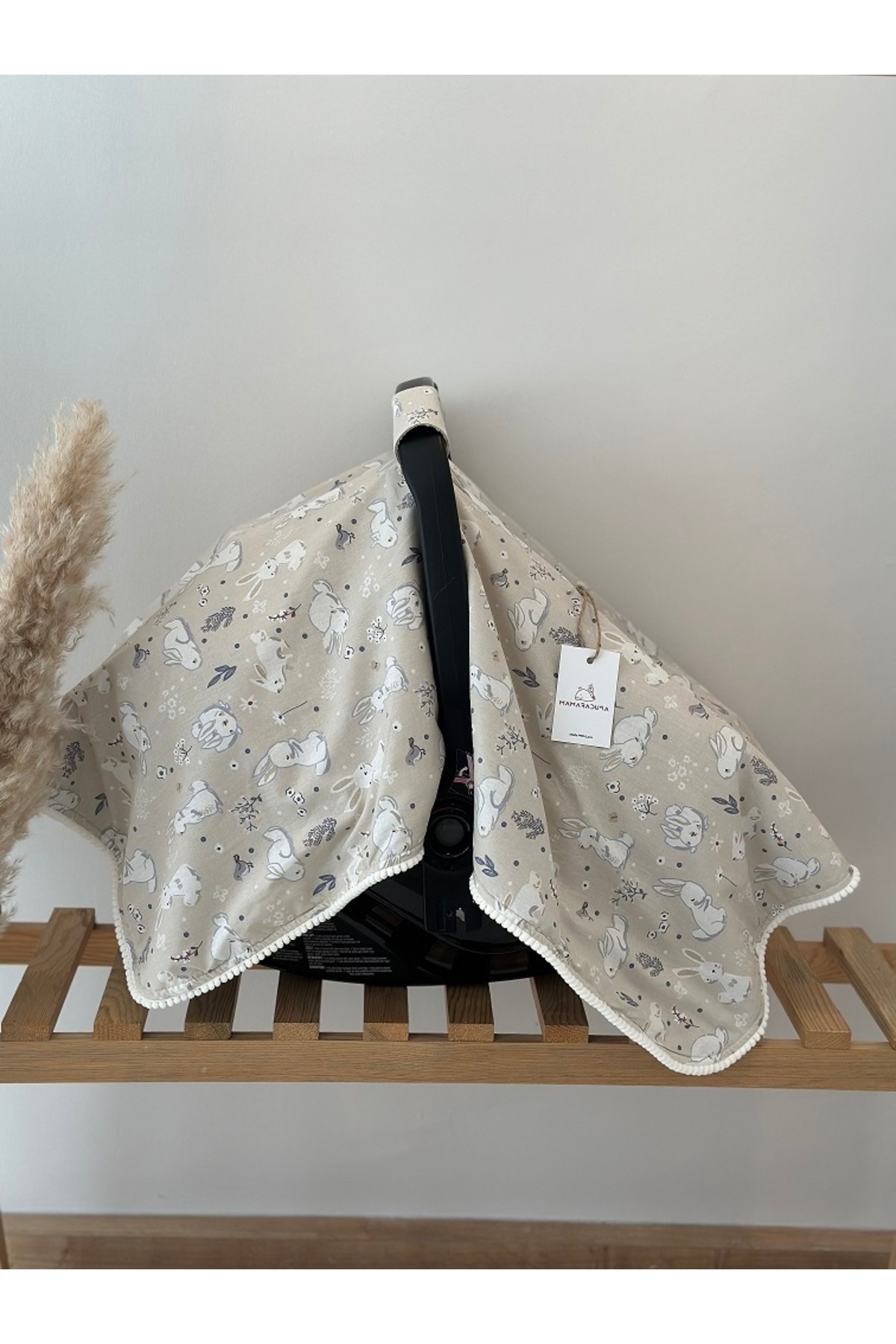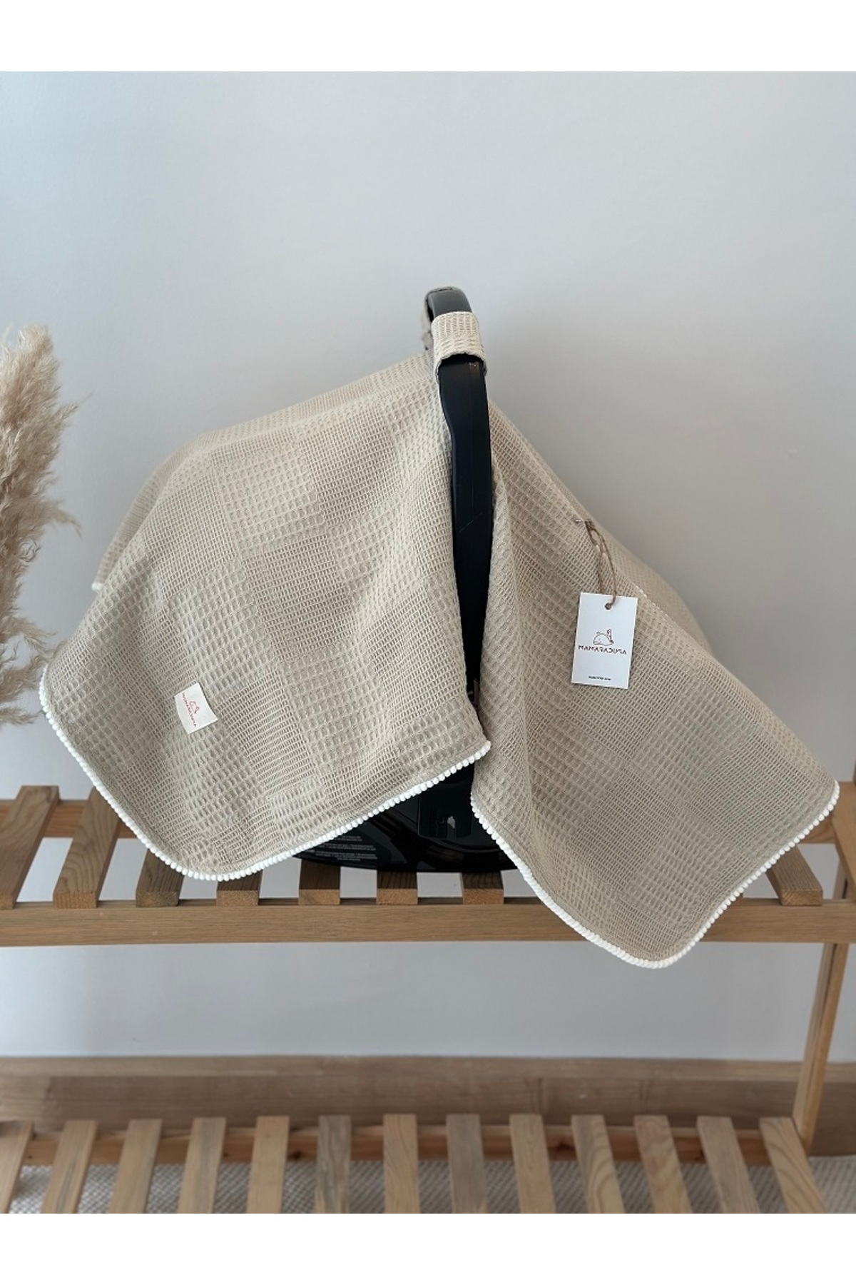 Puset Örtüsü- Çift Taraflı Kullanıma Uygundur.(Bir Tarafı % 100 Organik Pamuk Poplin Kumaş, Bir Tarafı % 100 Pamuk Waffle Pike Kumaş. Aplike Ve Minik Sıralı Ponpon Süslemeli.)