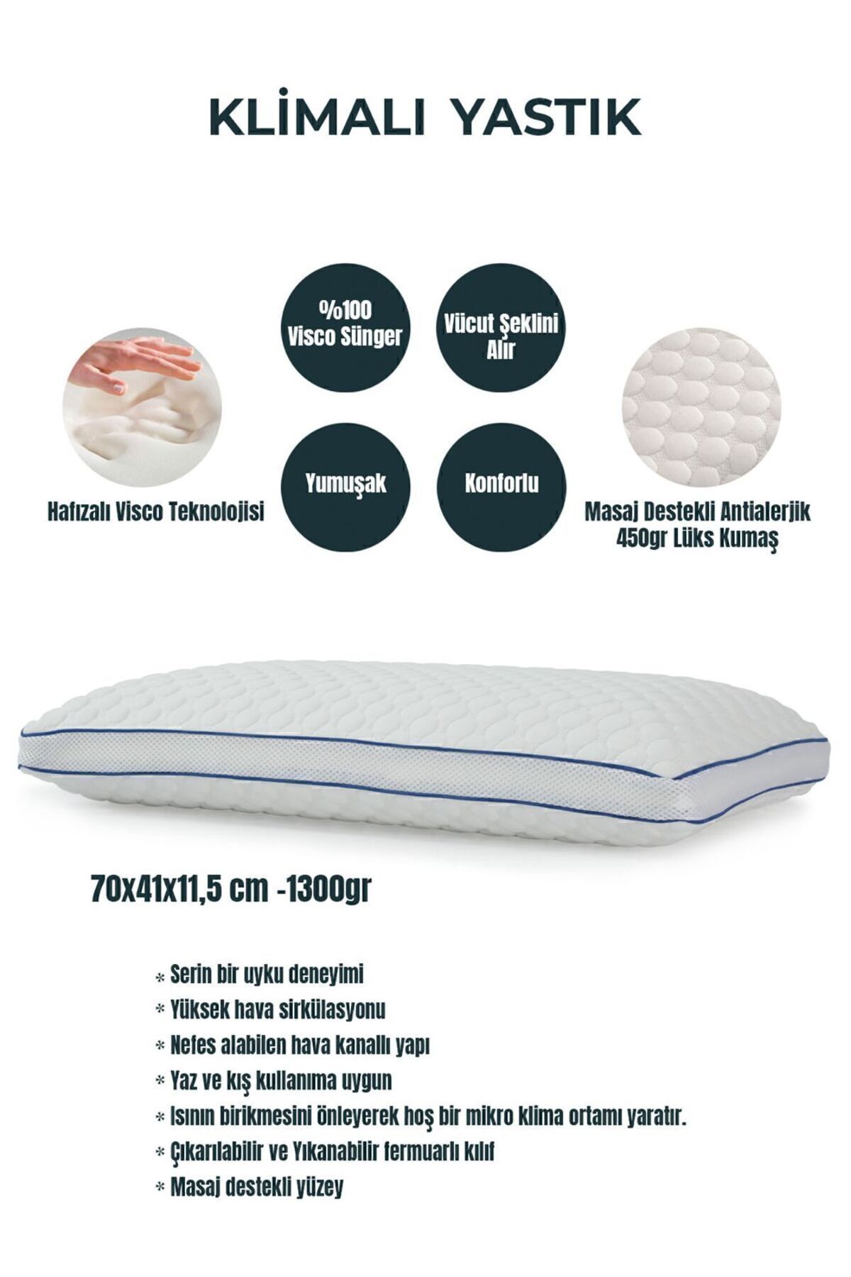 - Ebat: 70x41x11,5 cm - ağırlık : 1300 gr - kılıf: Masaj destekli 450 gr örme kumaş -materyal: Visco - air comfort yastığın belirli aralıklarla oluşmuş delikli yapısı lateks etkisi yaratarak uyku konforunuzu üst seviyelere taşır.