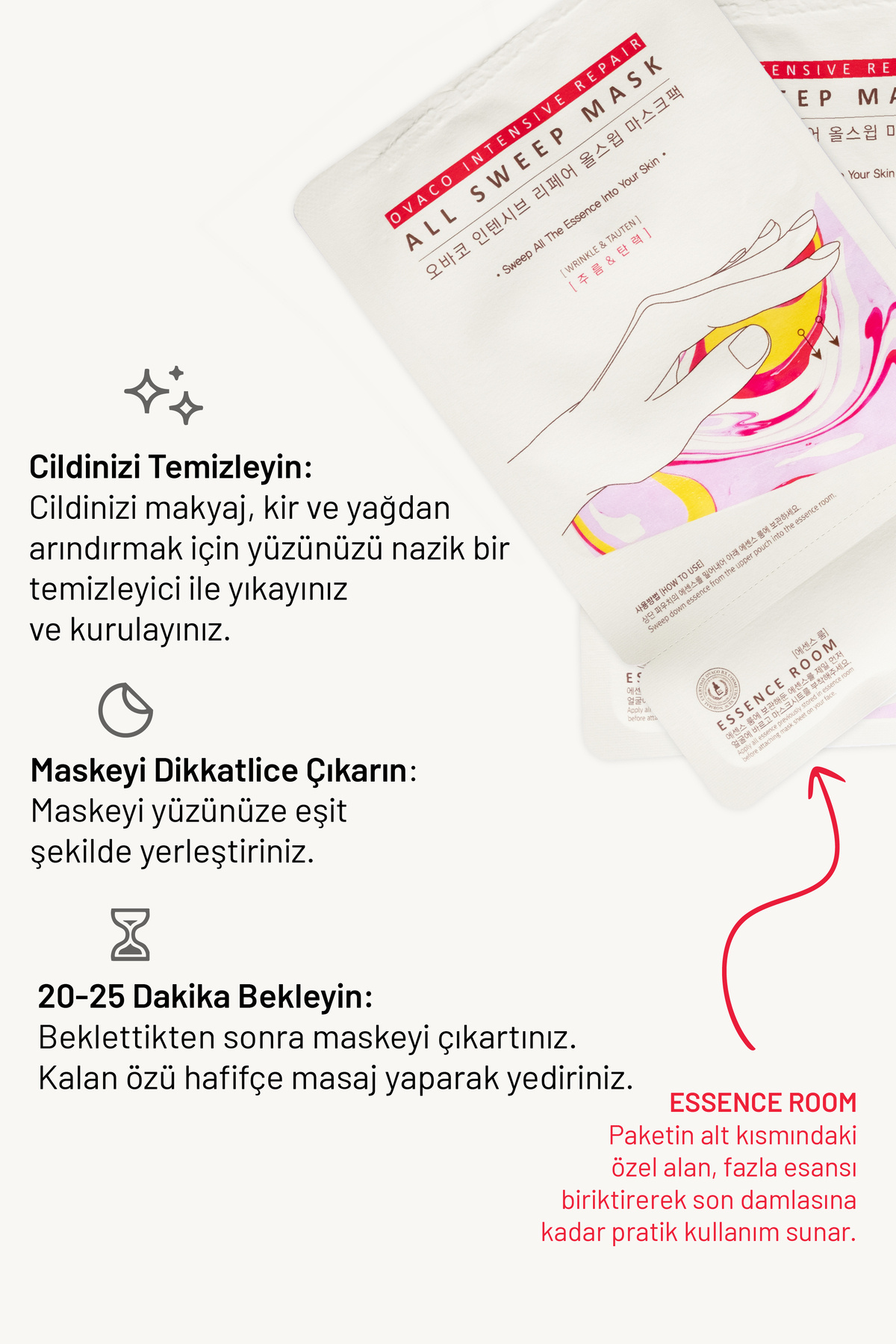 Ovaco Onarıcı ve Kırışıklık Karşıtı Yaprak Maske Cildinizi yeniden canlandırın ve gençlik ışıltısına kavuşun! Ovaco Onarıcı ve Kırışıklık Karşıtı Yaprak Maske, özel bir formülle zenginleştirilmiş olup cildinize derinlemesine nüfuz ederek onu nemlendirir, tazeler ve kırışıklıkları görünür şekilde azaltır. Özellikler Havyar Özü: Omega-3 yağ asitleri ve proteinler açısından zengin, kırışıklıkların azalmasına yardımcı olur ve cilt elastikiyetini artırır.