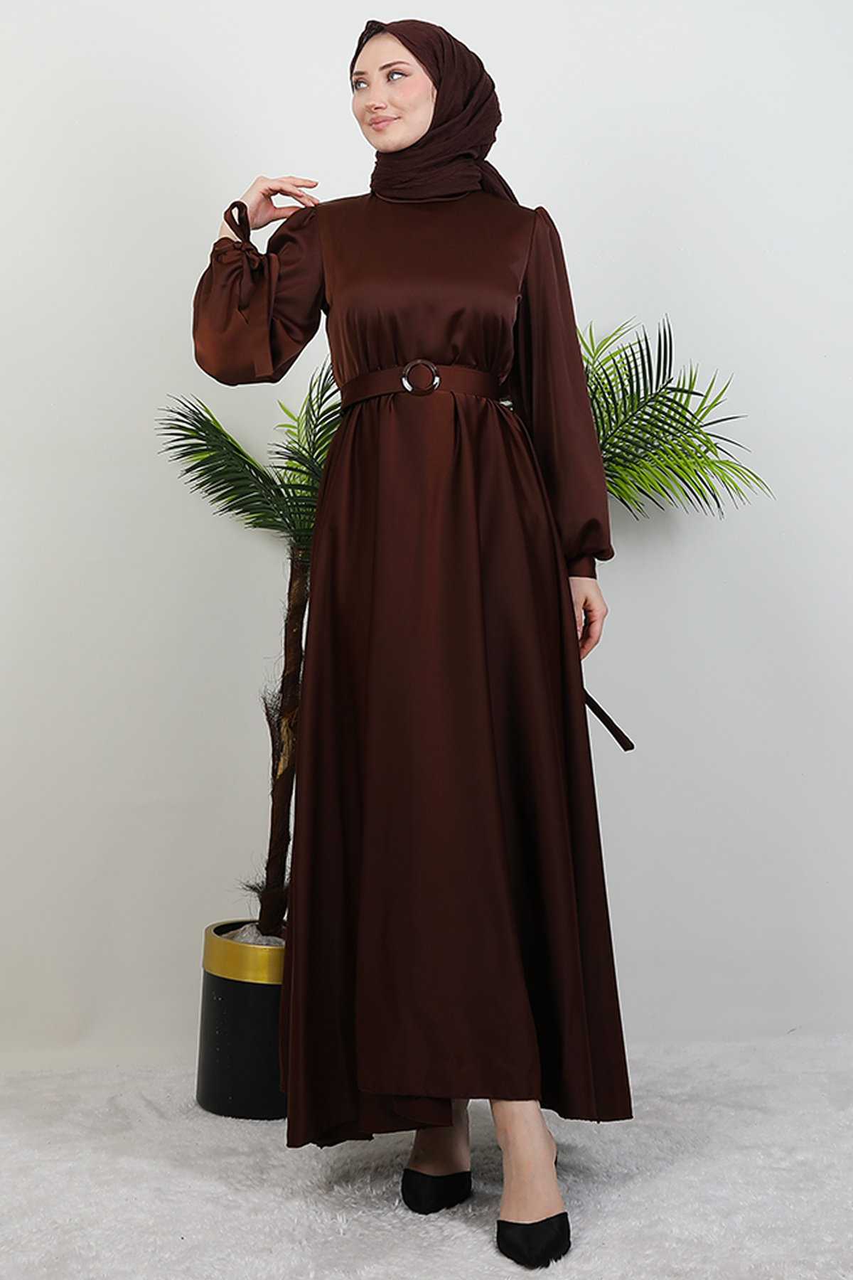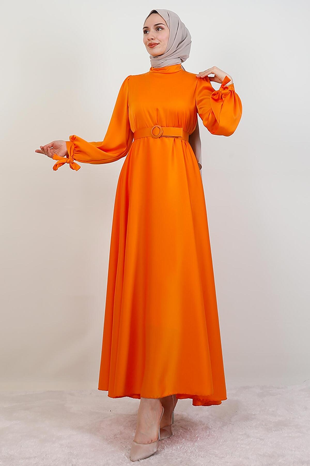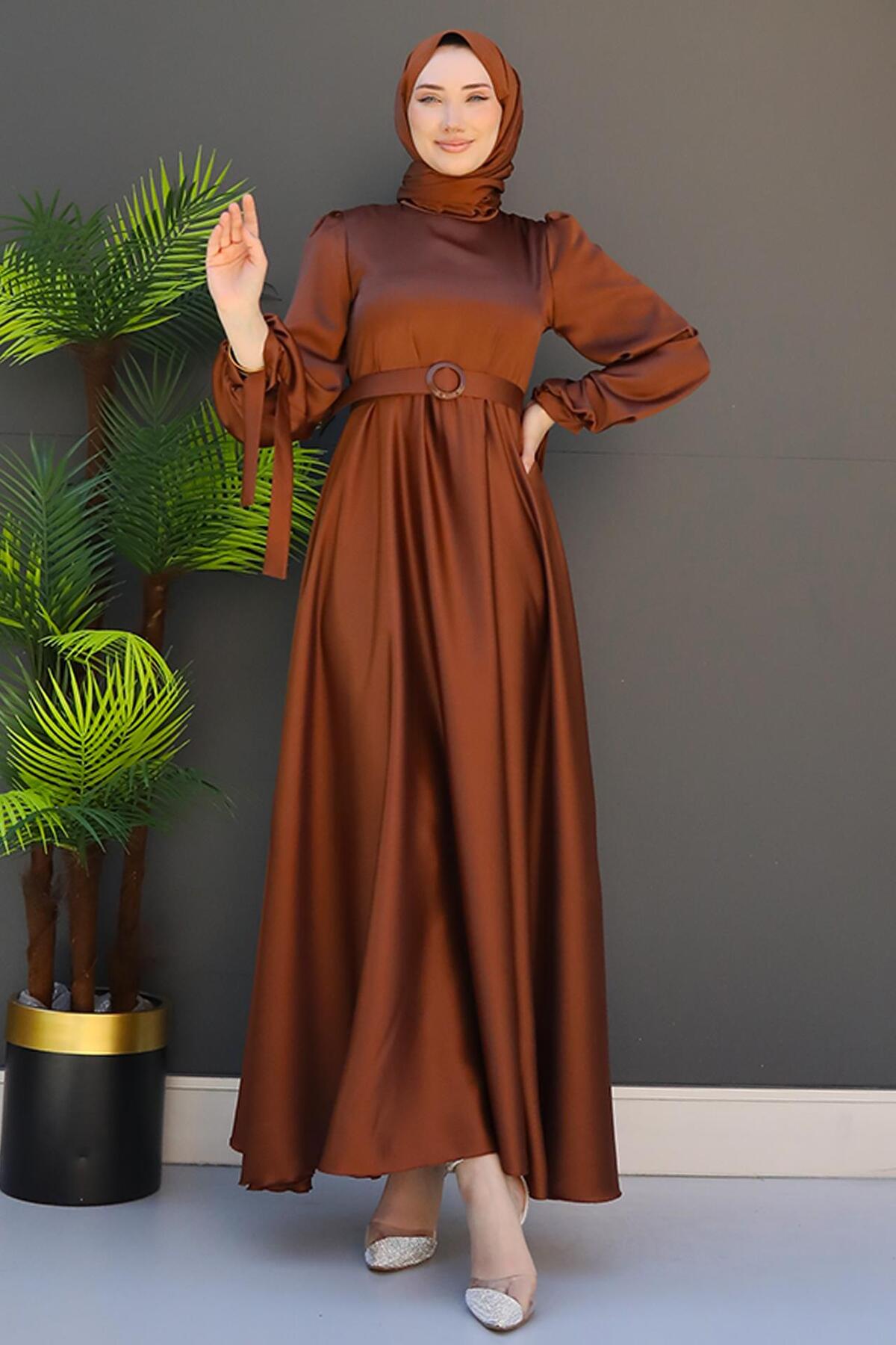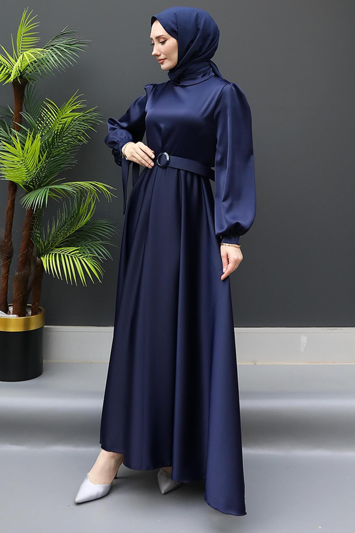 Tesettür giyim koleksiyonunun zarif bir parçası olarak tasarlanmış, her yaş grubuna hitap eden lacivert saten kemerli elbise