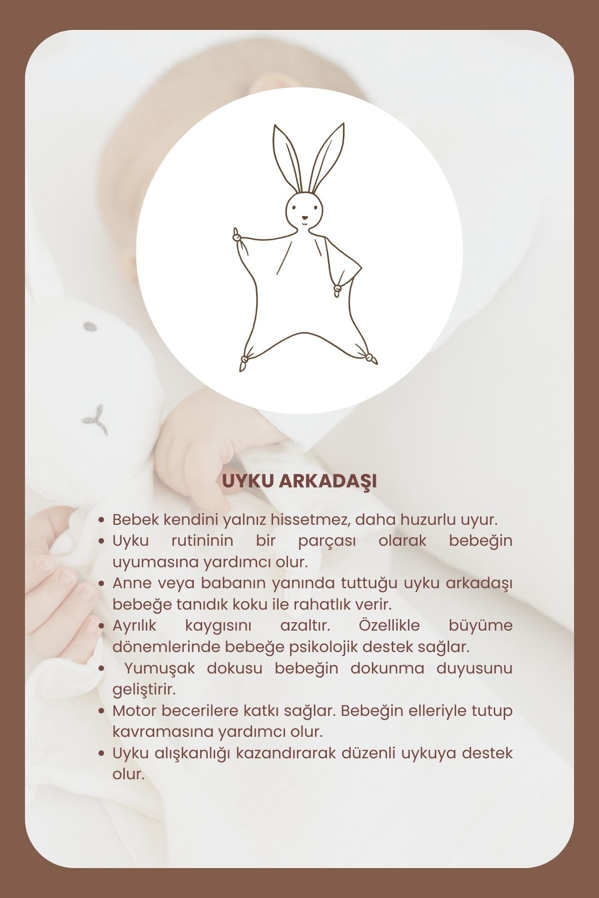 Bebeğinizin uyurken yanında güvenle bulundurabileceği, hijyenik ve kolay yıkanabilir bir uyku arkadaşıdır.