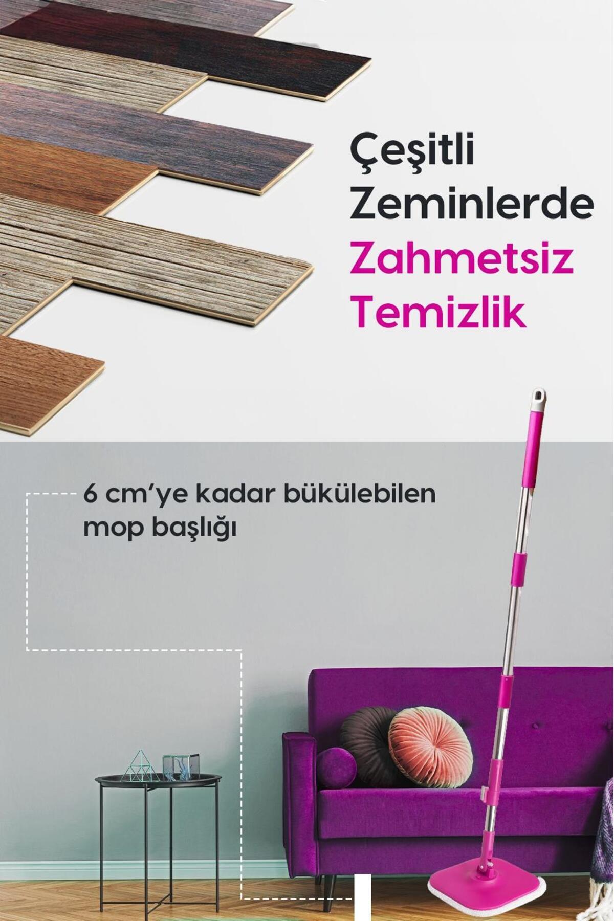 Az su kullanarak su tasarrufu ve etkin temizlik sağlar Ürün tasarımındaki mevcut fırça ve tarakları sayesinde yıkama ve sıkma işlemi sırasında üstündeki saç ve kılları kolayca toplar ve temizler %100 mikrofiber 3 katmanlı özel mop tasarımı sayesinde ve içeriğinde bulunan misina ve kanca iplik yapısı ile temizlik yaptığınız yüzeydeki saç ve kılları toplar Kare şekli sayesinde köşelere kolayca ulaşabilirsiniz 6 cm'ye kadar yüksekliğe sahip tüm koltuk altlarında mopunuzla rahatlıkla temizlik yapabilirsiniz 360' dönen başlığı,mandallı kilidi ile oldukça kolay bir kullanım sağlar Mopunuzun cırtlı yapısı sayesinde kolayca takıp,çıkarabilir , makinada yıkayabilirsiniz Mopunuzu yatay ve dikey tam yüzeylerde kullanabilirsiniz İster temiz su kapağını açarak,isterseniz kova üzerindeki boşluklardan pratik bir şekilde temiz su ilave edebilirsiniz Kovanın altındaki tıpayı açarak kirli suyu kolayca boşaltabilirsiniz Dar alanlarda kolayca saklayabilirsiniz Mopun dönmesi hızlandığında mop çok az yükselir ve su ile temasını keserek sıkma işlemine geçer Merkezkaç kuvveti ile moptaki su kirli su haznesine dökülür ve mopun kuruması sağlanır.