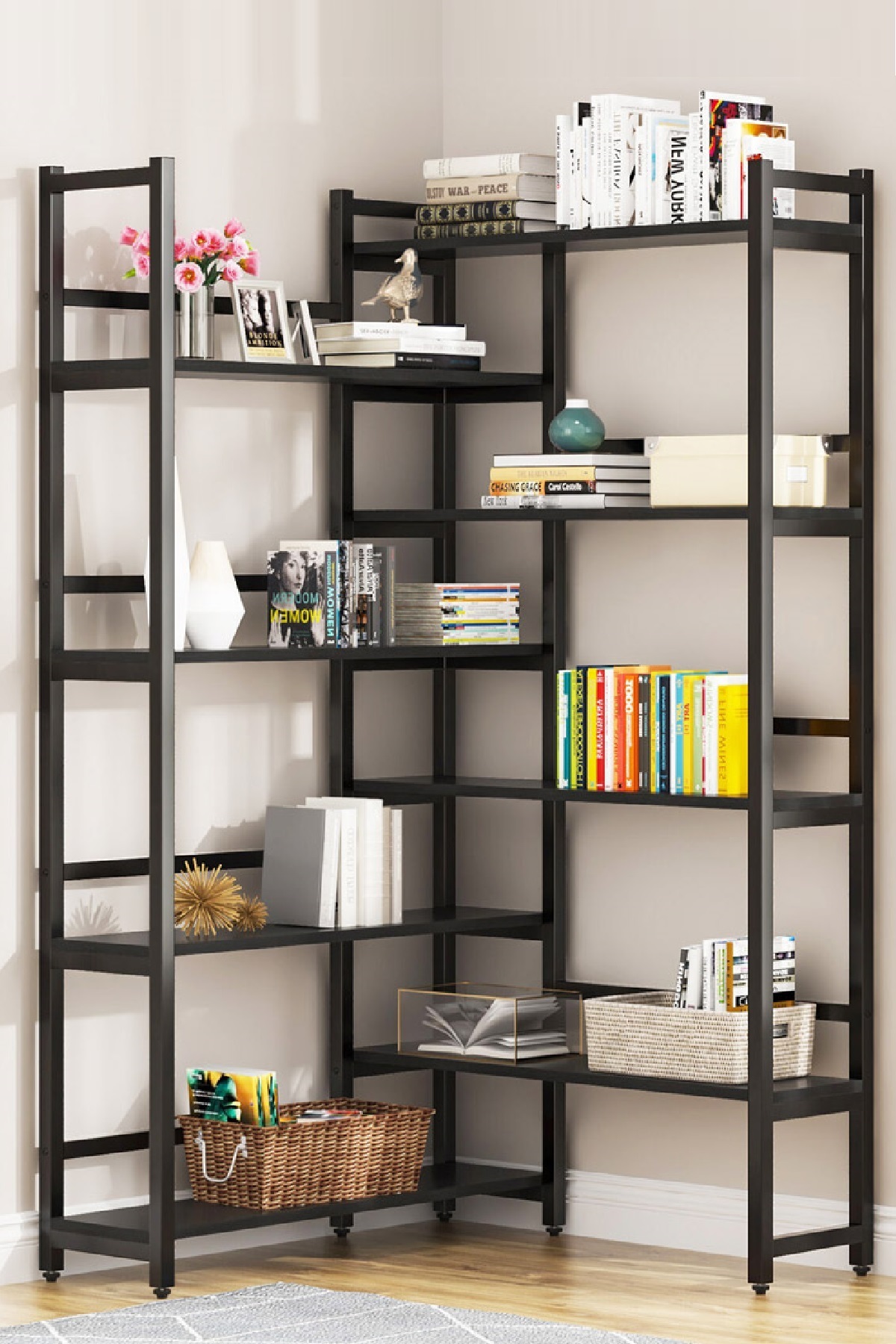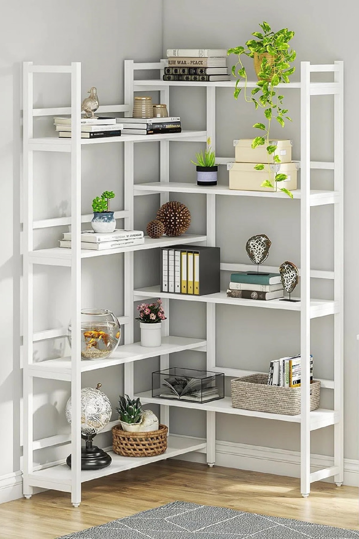 Modern tasarımıyla evinizin dekorasyonuna şıklık katan 8 katlı metal köşe kitaplık, hem klasik hem de modern stilleri bir arada sunar