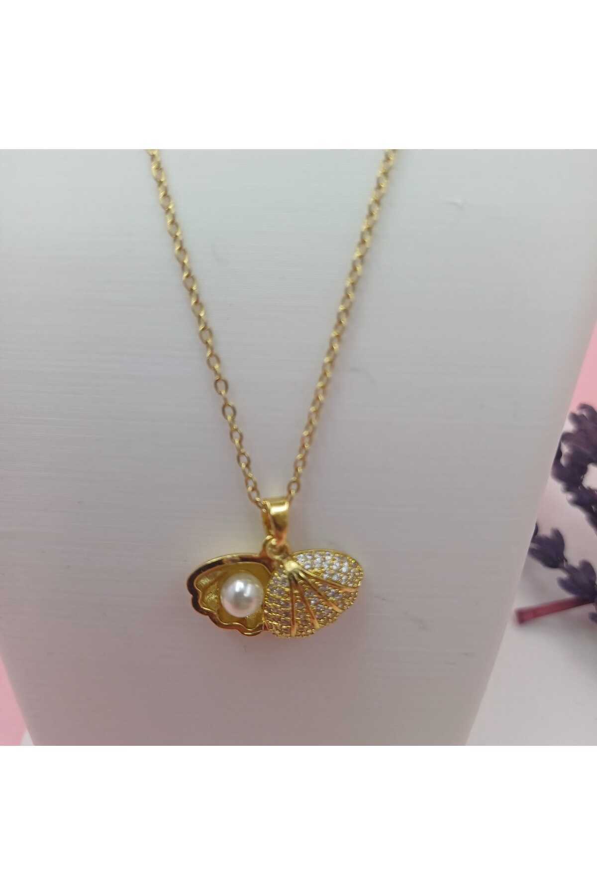 Zarif tasarımıyla dikkat çeken bu kolye, deniz kabuğu inci detaylarıyla göz alıcı bir görünüm sunar.
