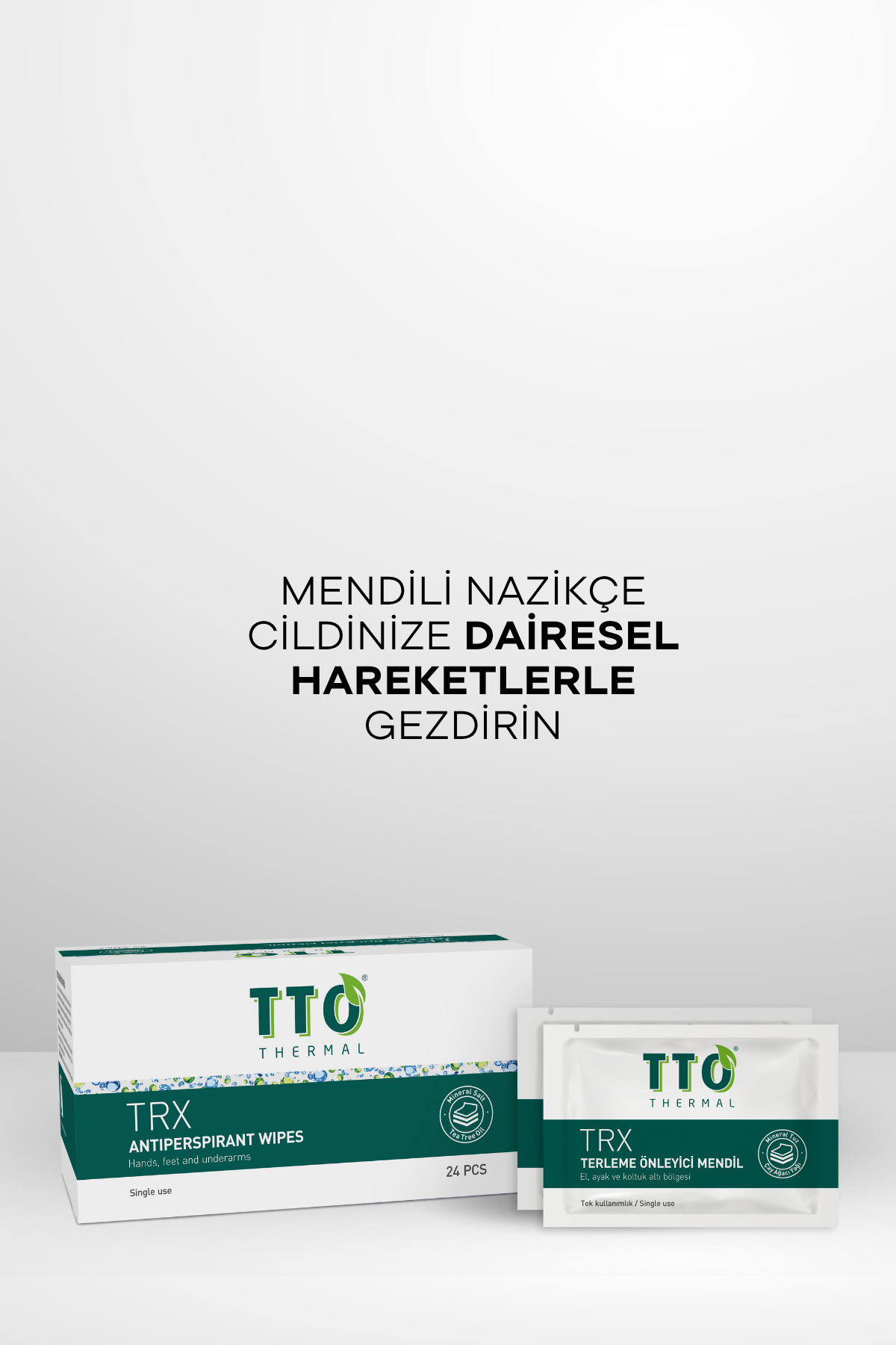 TTO TRX TERLEME ÖNLEYİCİ MENDİL 24 ADET El, ayak ve koltukaltı bölgesinde terleme ve ter kokusunu önlemeye yardımcı olmak amacı ile özelolarak geliştirilmiş kozmetik bir üründür. İçeriğindeki doğal mineral tuz