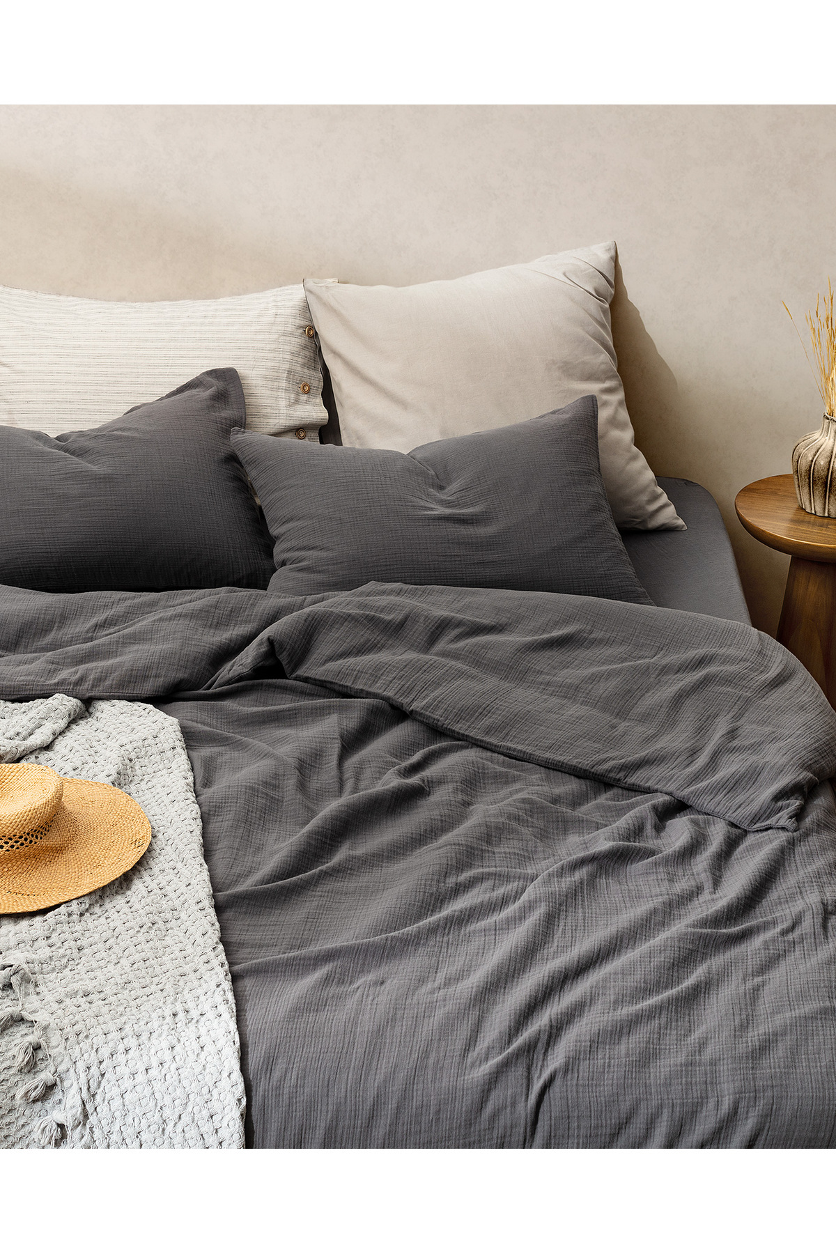 Marla Müslin %100 Pamuk King Size Nevresim Takımı Lastikli - Antrasit Evinizin en özel köşesi olan yatak odanızı yenilemek ve güzelleştirmek için lastikli nevresim takımı çok doğru bir tercih olacaktır.