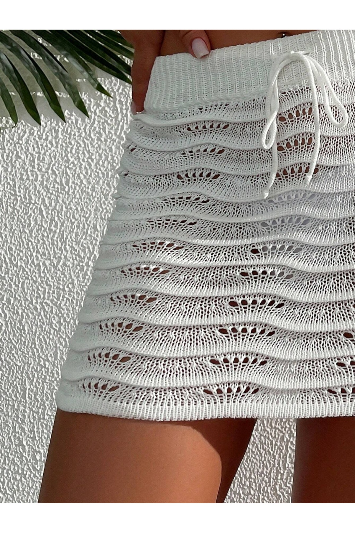 Kadın İp Bağlamalı Dalgalı Ajurlu Yazlık Plaj Süper Mini Beyaz Triko Etek Poreo