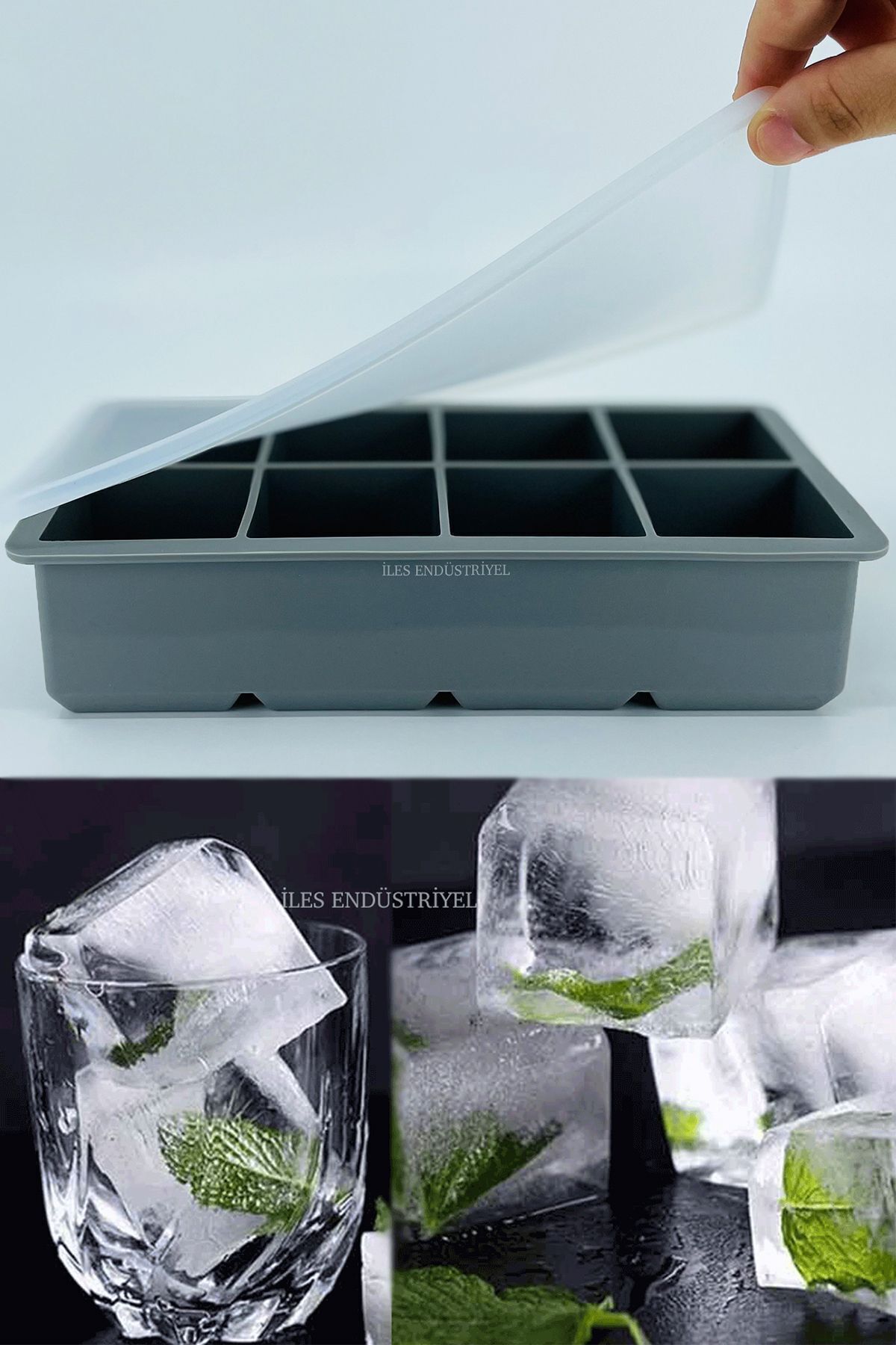 Kapaklı Premium Büyük 8 Bölmeli Silikon Buz Kalıbı, Gri