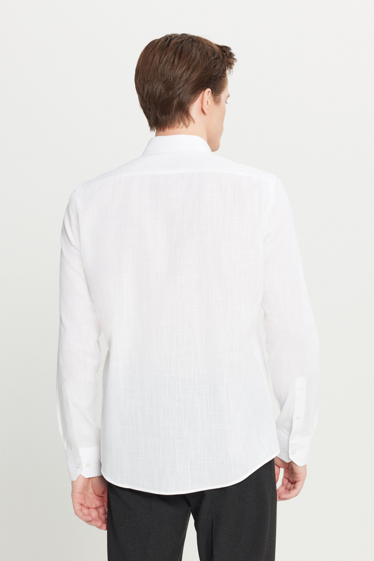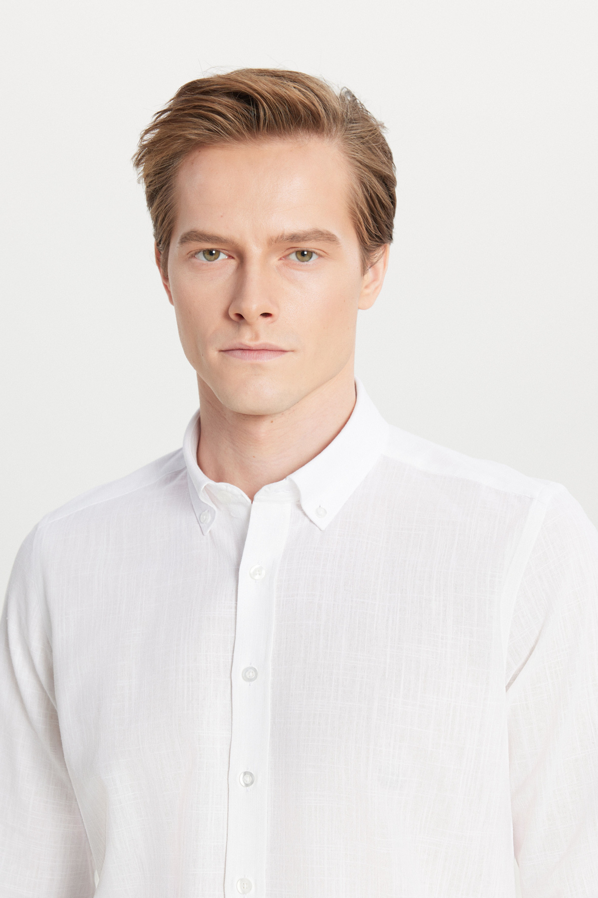 Keten Görünümlü %100 Pamuk Nefes Alabilen Kumaş Düz Beyaz, Casual Model, Tailored Slim Fit, Düğmeli Dik Yaka, Normal Manşet, Uzun Kol, Cepsiz, Yaz Koleksiyonu, AC&CO serisine ait casual tarzdaki tasarımlar, günlük stilinizden hafta sonuna kadar her anınızda yeni favorileriniz olmaya aday.
