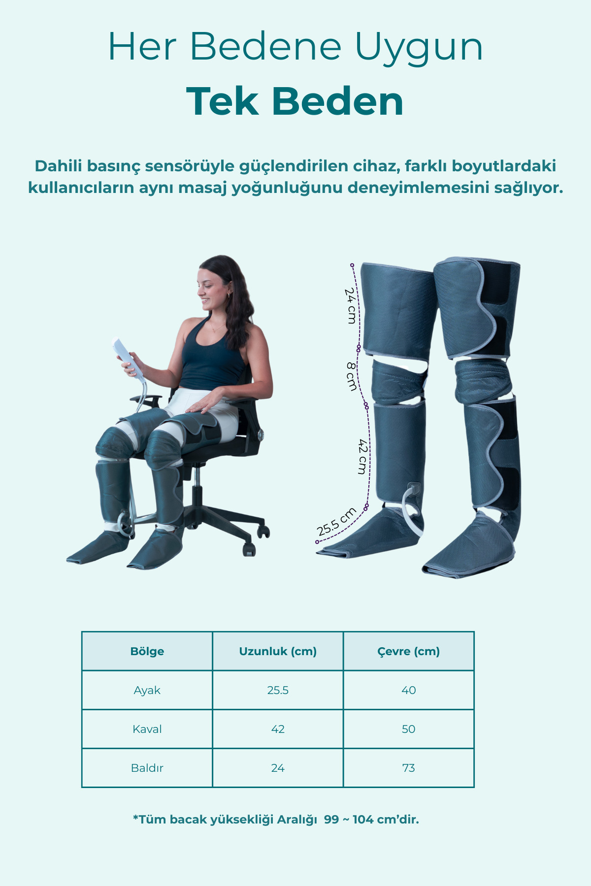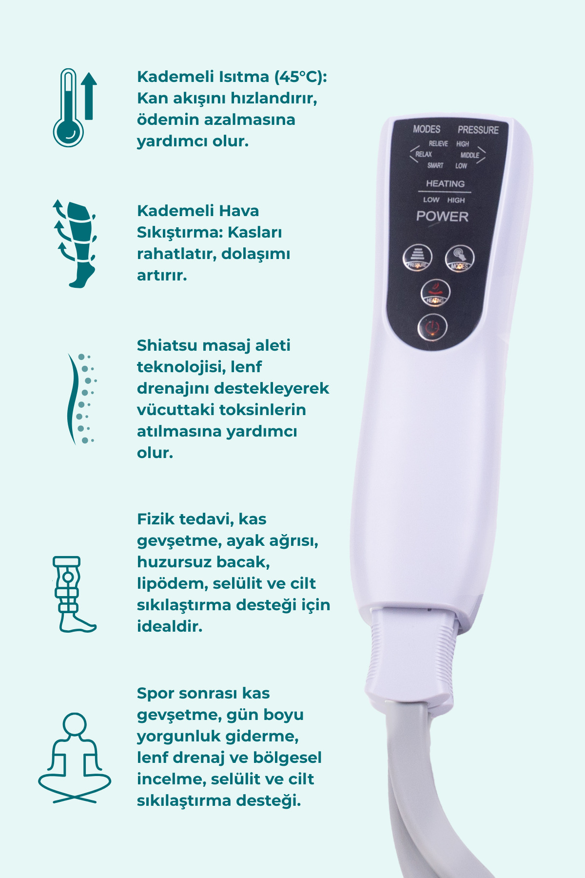 Fizik tedavi desteği, kas gevşetme, huzursuz bacak sendromu, lipödem, ayak ağrısı, selülit görünümünü azaltma ve cilt sıkılaştırma gibi birçok amaç için idealdir.