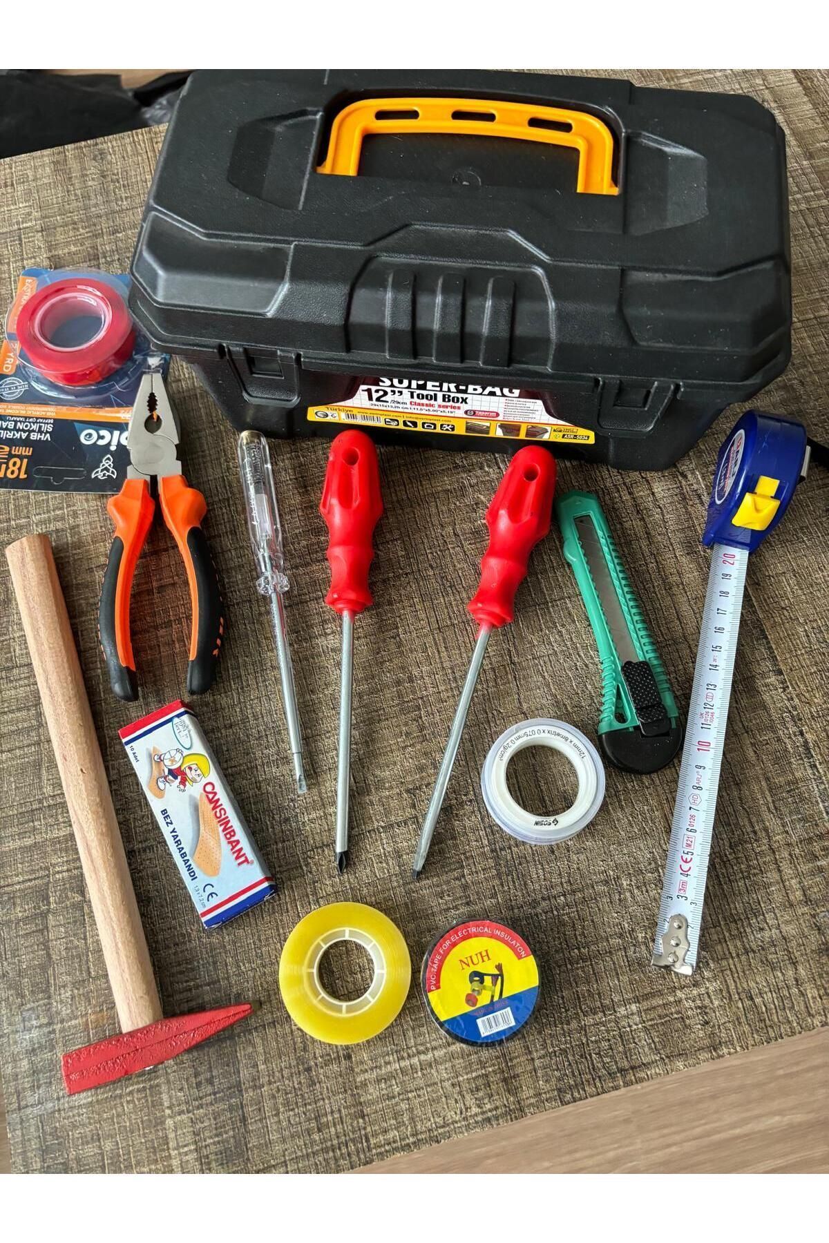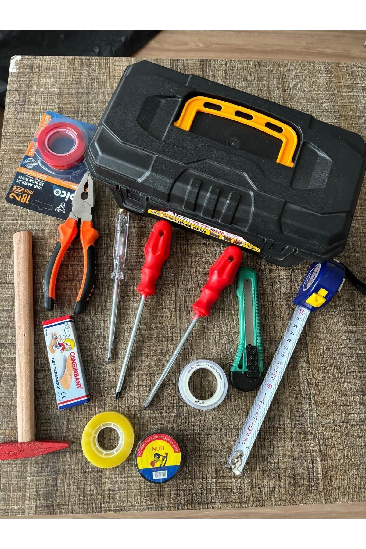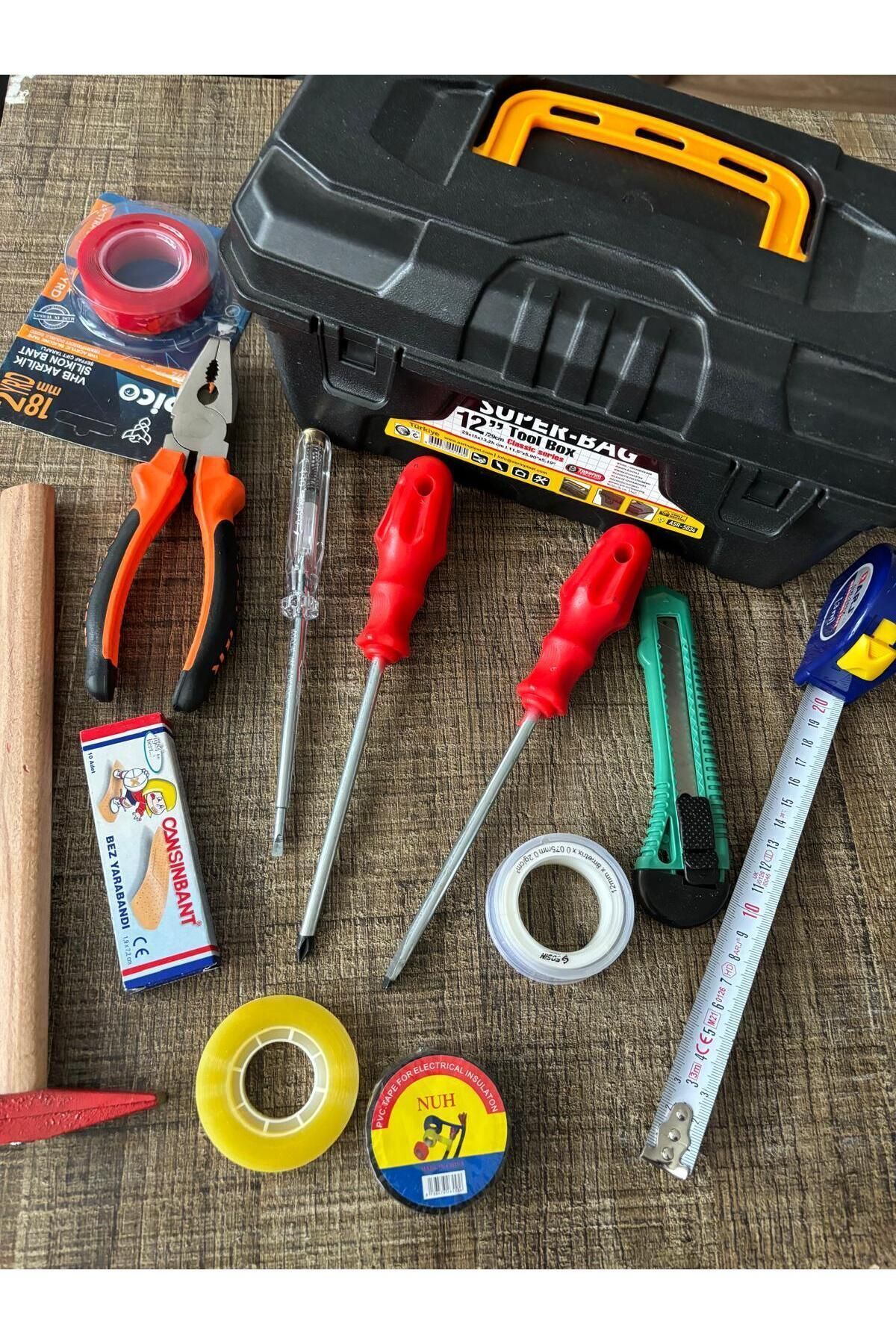paket içeriği 1 adet takım çantası 1 adet pense 1 adet şerit metre 1 adet düz tornavida 1 adet yıldız tornavida 1 adet kontrol kalemi 1 adet maket pıçağı 1 adet montaj bantı çiftaraflı 1 adet elektirik bantı 1 adet teflon bant 1 kutu 10 adet yara bantı1 adet 100grm küçük çekiç