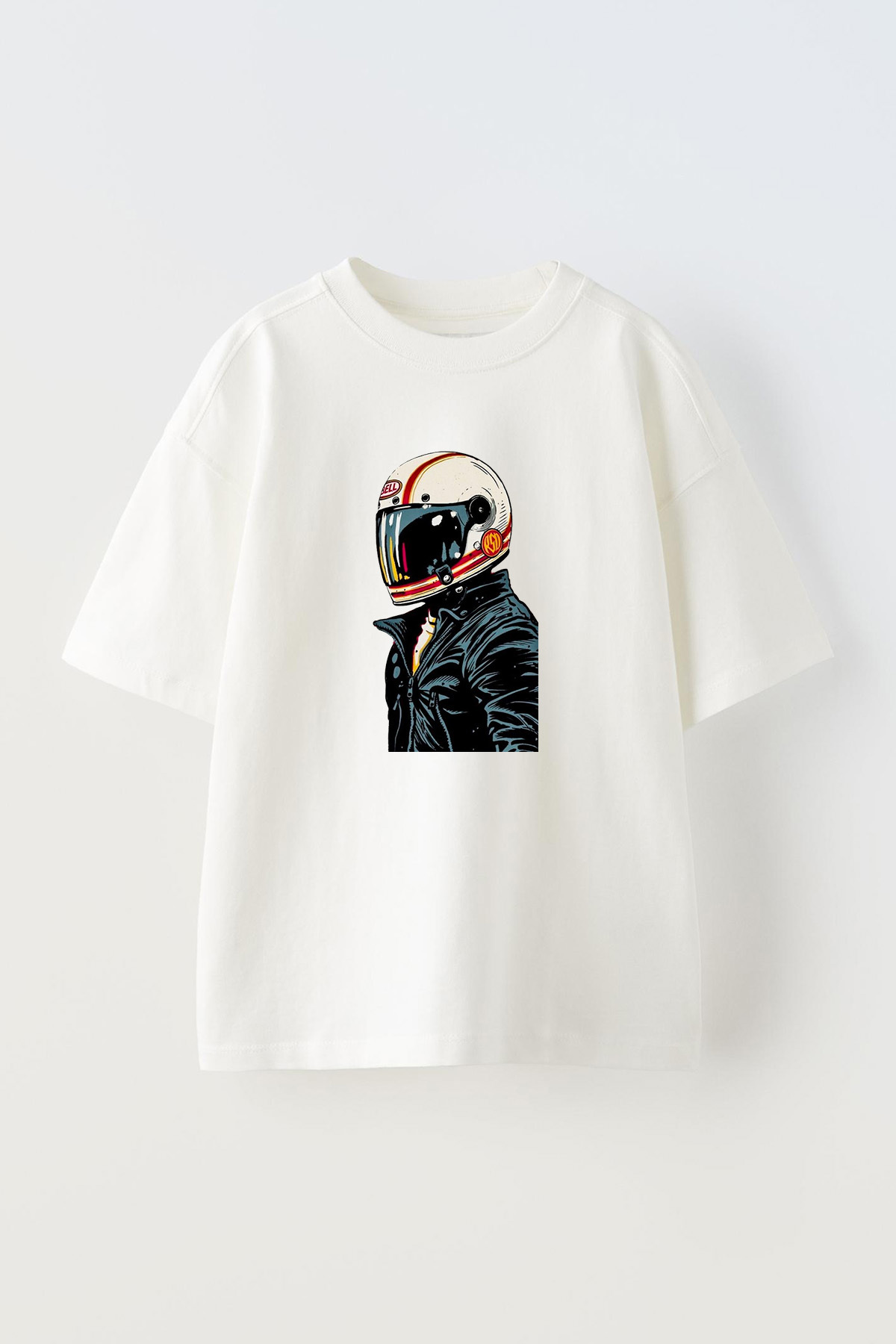 Her yaş grubuna hitap eden, trend bir stil sunan siyah oversize pamuk deri mont kasklı motorcu baskılı örme t