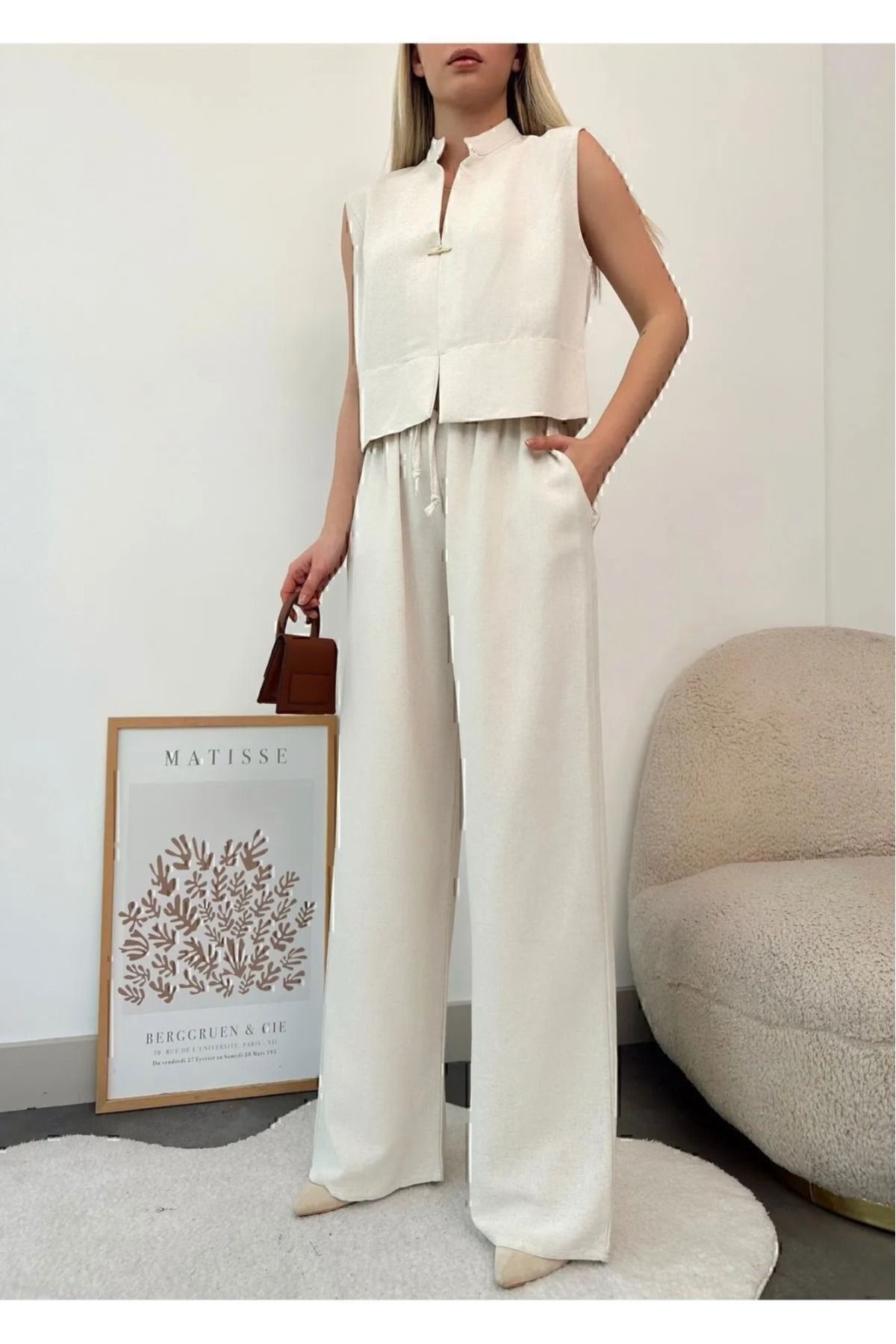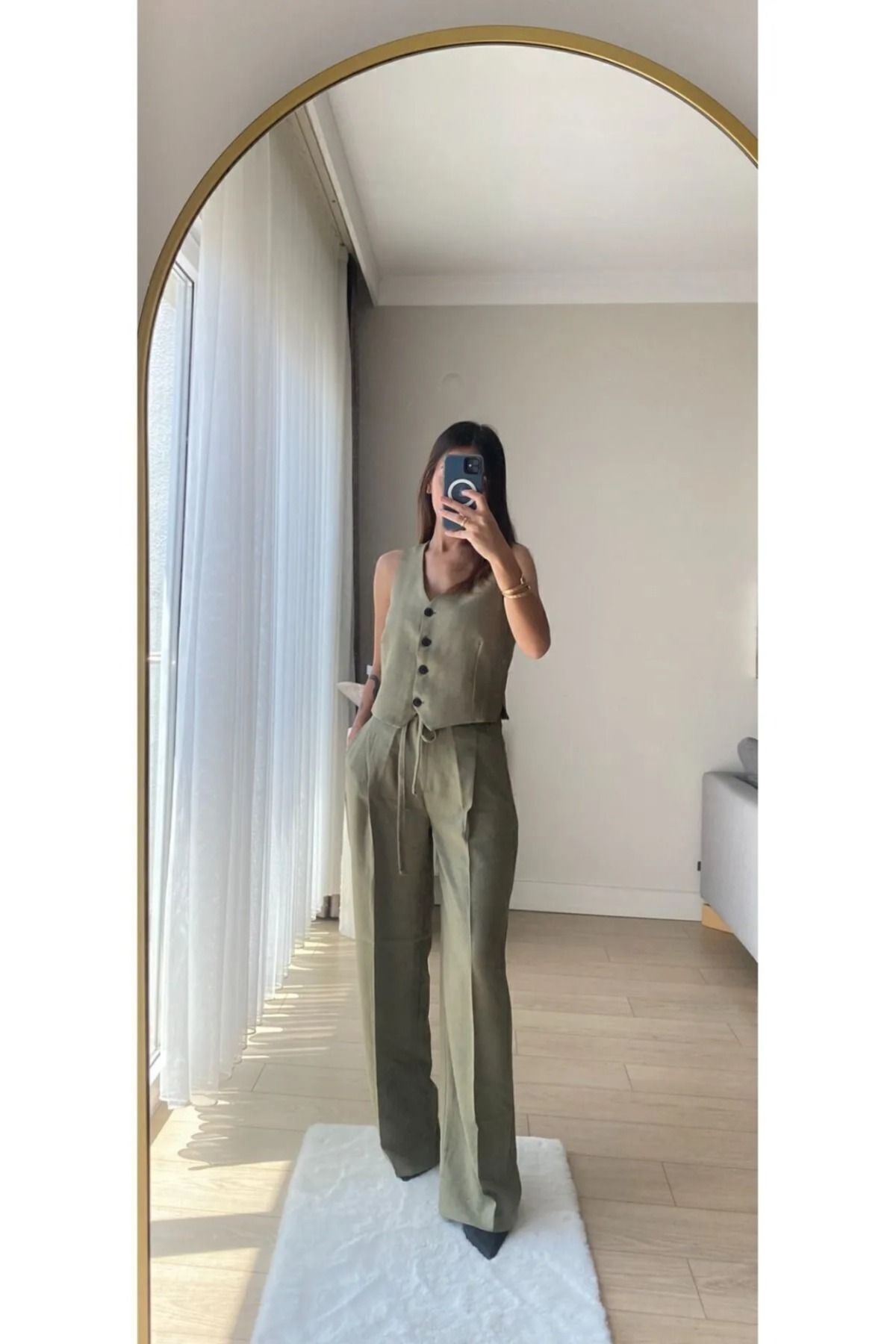 Günlük giyimde şıklığı ve konforu bir arada sunan kadın siyah keten pantolon yelek takım, oversize kalıbı ile rahat bir kullanım sağlar