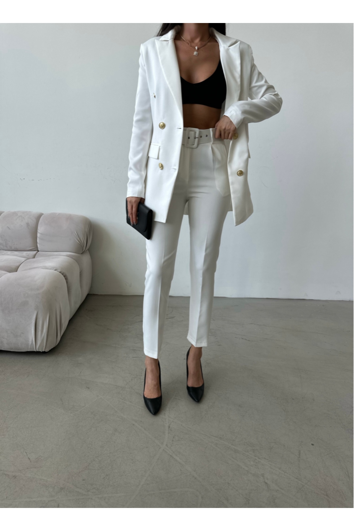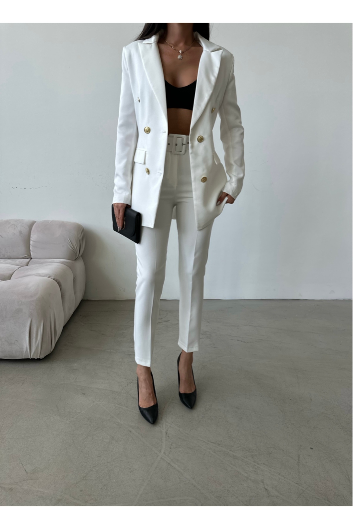 - Design koleksiyonuna özel tasarlanmış, şıklığı ve rahatlığı bir arada sunan beyaz düğmeli blazer ceket esnek pantolon kadın takım elbise