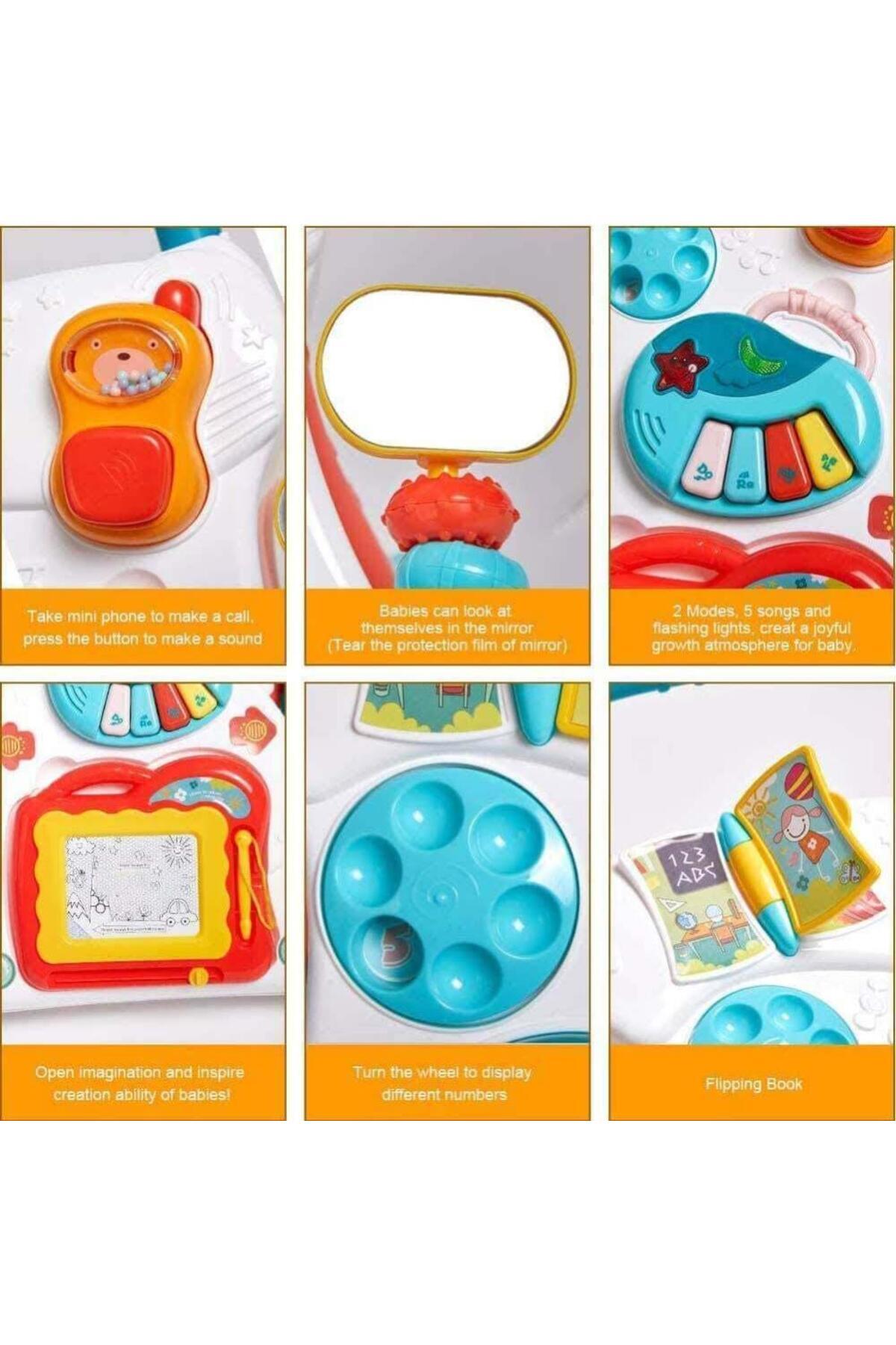 [Yetenek Geliştirme] : manuel beyin, kavrama, entelektüel gelişim, emekleme, görme, ilgi geliştirme, duygu, işitme, ebeveyn-çocuk iletişimi, el-göz koordinasyonu ?Çoklu Öğrenme Oyuncakları?: Erken eğitim müzik kutusu, mini cep telefonu çıngırak, çevirmeli sayfa küçük kitap, analog çağrı, mini ayna, küçük kadranlı kolye, tablet ?Çizim ve yazı tahtası?: Kalem ve renkli şekilli aksesuarlarla benzersiz şekilde tasarlanmış çizim ve yazı tahtası.