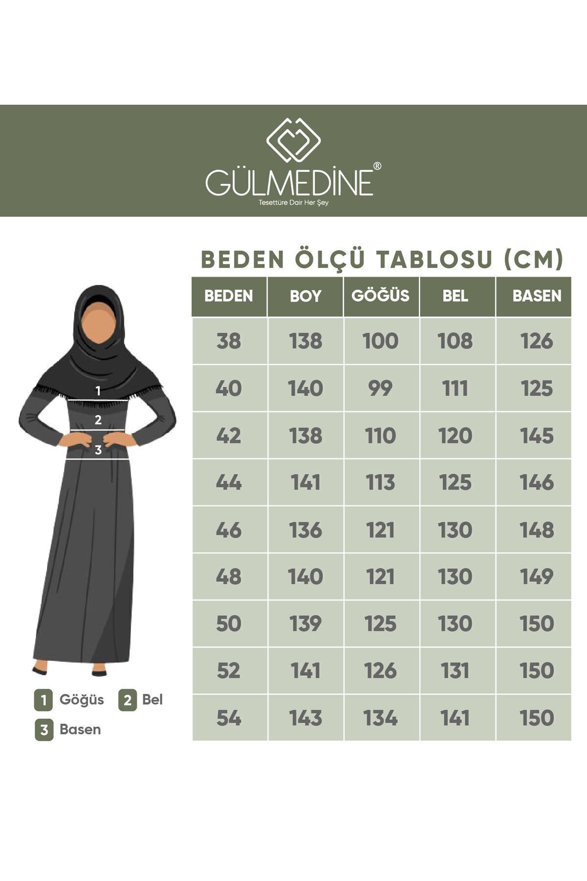 45-59 kg arası 38 beden 60-69 kg arası 40 beden 70-75 kg arası 42 beden 76-84 kg arası 44 beden 85-94 kg arası 46 beden 95-99 kg arası 48 beden 100-109 kg arası 50 beden 110-119 kg arası 52 beden 120-129 kg arası 54 beden 130-139 kg arası 56 beden 140-149 kg arası 58 beden 150-170 kg arası 60 beden Boyu 145 cm dir.