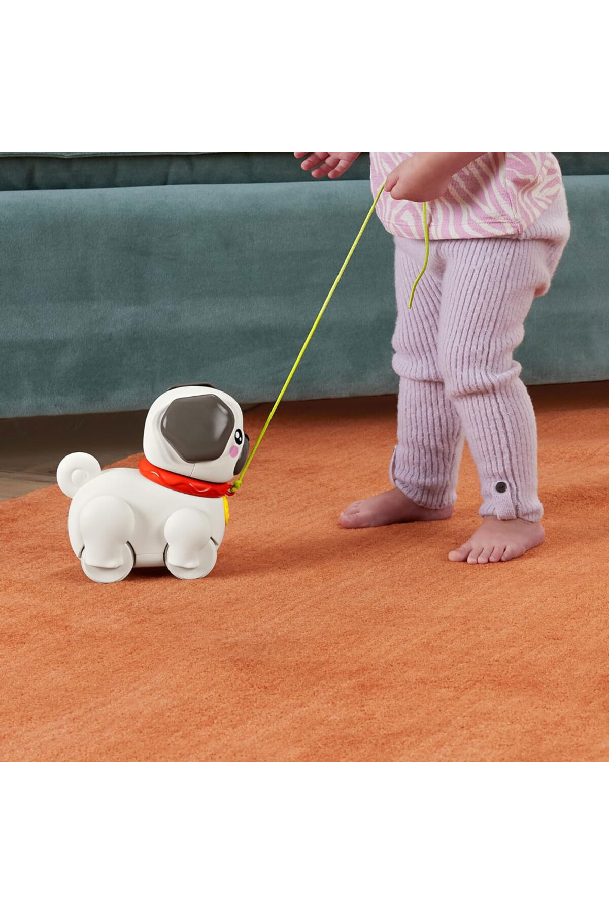 Tasması çekilince bacaklarını ve kulaklarını hareket ettirip sevimli bir havlama sesi çıkaran bu köpek, minikleri yürümeye ve kaba motor becerilerini geliştirmeye teşvik eder.