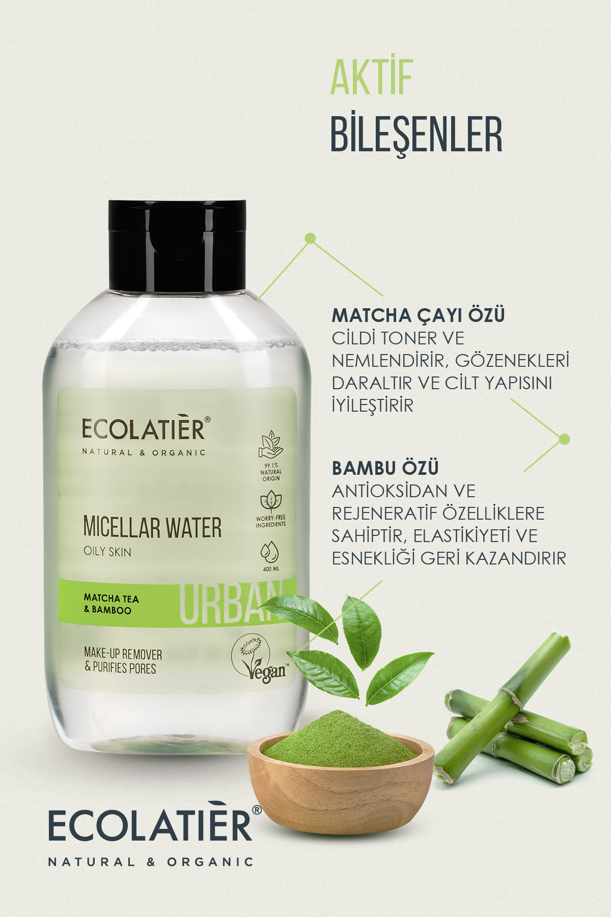 Misel Su Yağlı Ciltler İçin, 400 ml Matcha Çayı ve Bambu.