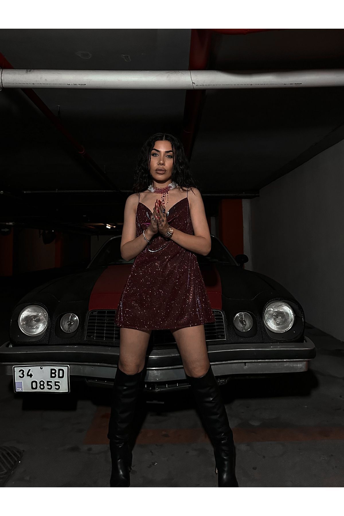 - Askılı tasarımı ile omuzları zarifçe sergileyen bordo simli mini elbise, özel günlerinizde göz alıcı bir görünüm sunar