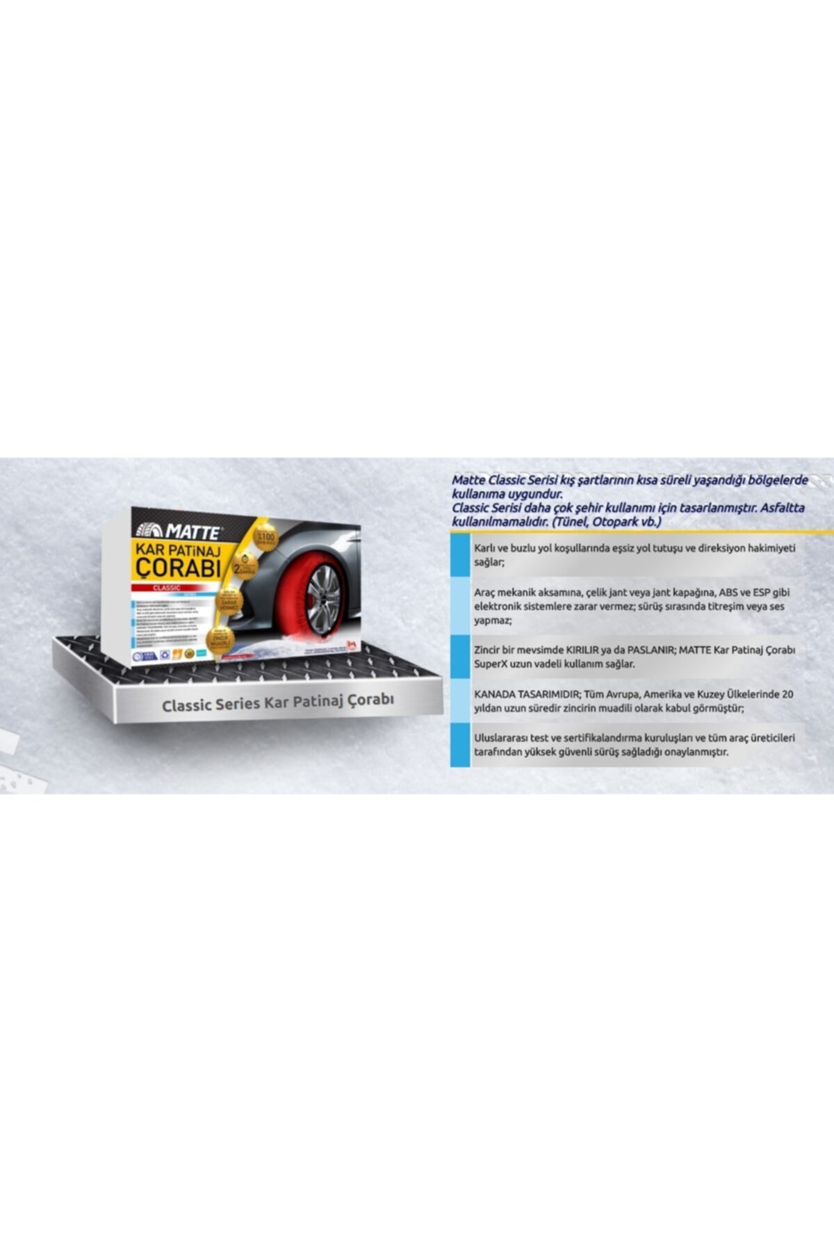 tüm Avrupa, Amerika ve Kuzey Ülkelerinde 20 yıldan uzun süredir zincirin muadili olarak kabul görmüştür. Bilindiği üzere eski tip zincirler ilk kullanım sonrasında ya kopar yada bir sonraki kış için saklanırken paslanır. Matte Kar Patinaj çorapları uzun yıllar kullanım imkanı sağlayarak çok daha ekonomik çözüm sunar. Matte, sahip olduğu son derece yüksek mukavemetli yapısı sayesinde yapılan tüm testler ve tüm kullanım senaryolarından hiçbir zarar görmeden başarı ile çıkmıştır. Uyarılar : -Araç Lastikleri üzerinde belirtilen ebatları kontrol ederek, kendi lastiğinize uygun olan Matte Kar Çorabını kullanınız. -Kutu içeriğinde belirtilen Kolay Montaj aşamalarını takip ederek Matte Kar Çorabını araç lastiğinize giydiriniz. -Çorabın lastiğe tam oturduğundan emin olduktan sonra sürüşünüze devam ediniz. -40km/s hızı geçmeden kar ve buzun olduğu bölgeden rahatça çıkabilirsiniz. -Ani hızlanma, ani fren ve virajlarda hızınızı azaltınız. -Karlı veya buzlu yoldan ana yola çıktığınızda Matte Kar Çorabını aracınızdan kolayca sökünüz. Öneriler: -Matte Kar Çorabını yol koşulları dahada kötüleşmeden veya saplanmadan takınız. -Montaj öncesi aracınızın yolun güvenli bir noktasında olduğundan emin olunuz. -Kaygan yollarda yanınızdan geçen araçlar çok yüksek tehlike arz ederler. -Matte Kar Çorapları uzun yıllar kullanılabilecek şekilde tasarlanmıştır. Gerek olmayan durumlarda yada test etme amacı ile kuru asfalt veya toprak üzerinde kullanmayınız. ÖNEMLİ Uyarı: Lütfen aracınızın marka, model ve üretim yılı dışında, lastiğin yan yüzeyinde yazılı olan lastik ölçüsünü kontrol ediniz. Aracınızın fabrika çıkış lastiklerinin ölçülerinde değişiklik yaptıysanız, yeni lastik ölçülerinize uyumlu olan Kar Çorabını sipariş ediniz.
