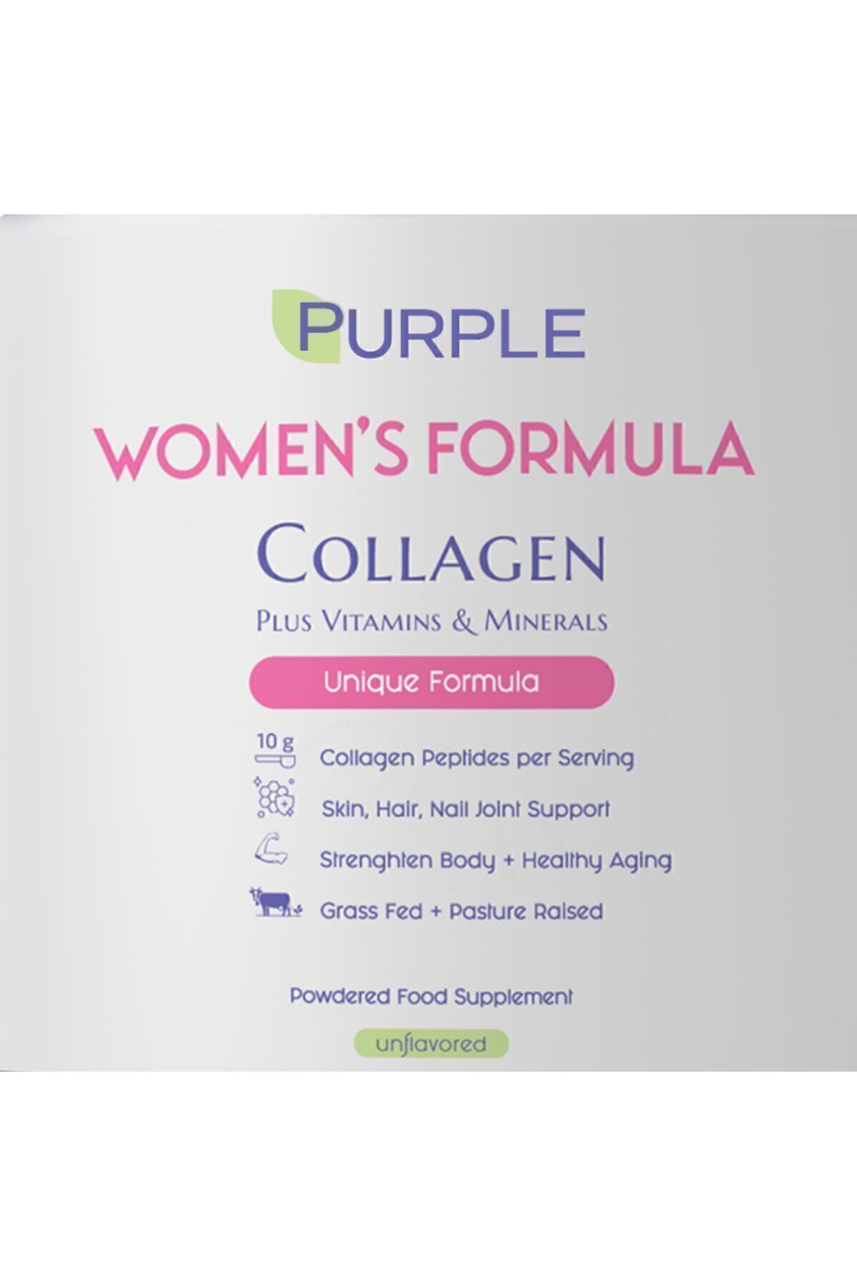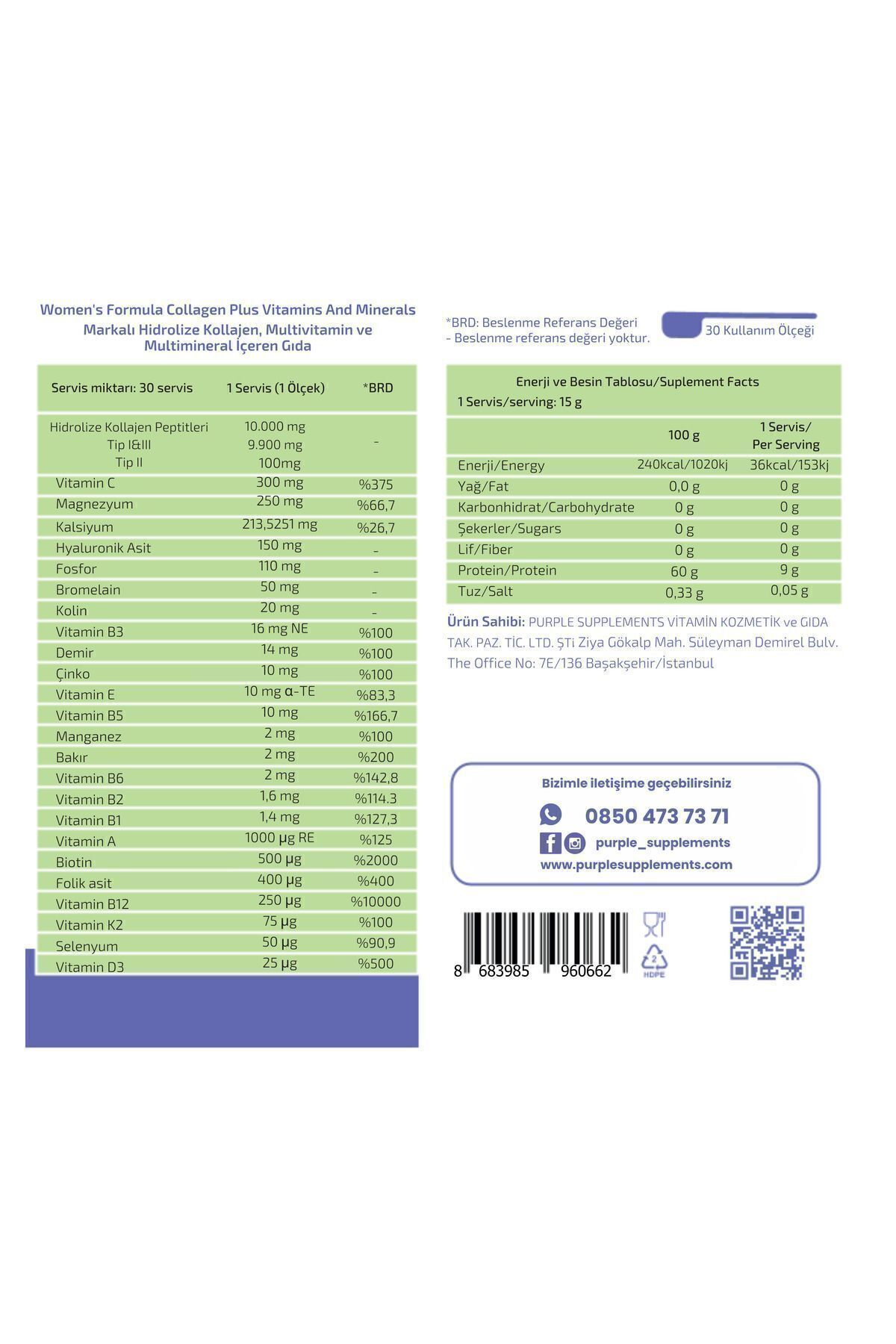 PURPLE WOMEN'S FORMULA KOLAJEN Kadınların güzelliğini ve sağlığını destekleyen, 8 mineral ve 13 vitamin ile zenginleştirilmiş Purple Women's Formula Kolajen ürünümüzü tanıtmaktan heyecan duyuyoruz! Kadınlar için özel olarak formüle edilen bu üründe Bromelain, Hyaluronic Asit ve Choline gibi ekstra bileşenler bulunmaktadır