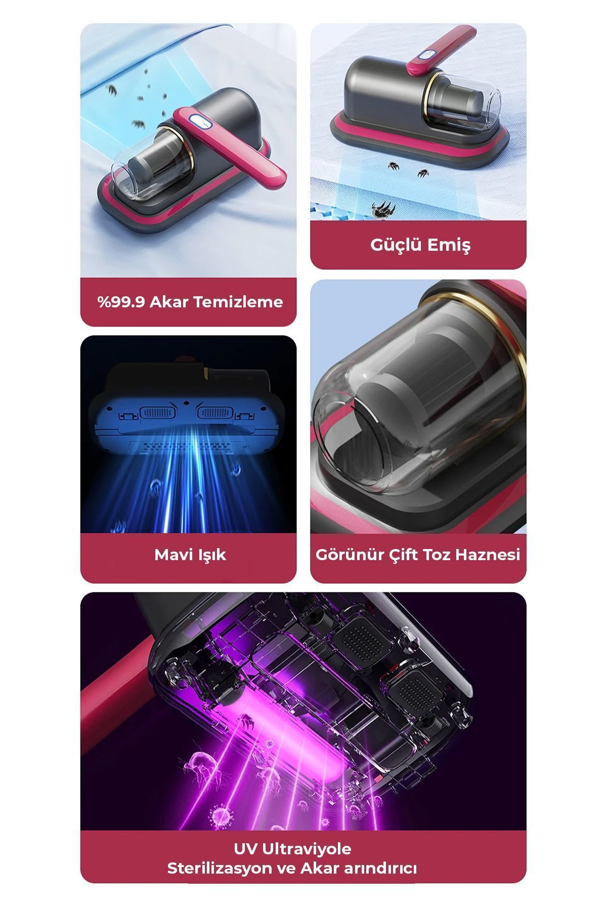 Yatak, kanepe, halı gibi yüzeylerde toz ve tüyleri etkili bir şekilde gideren bu el vakum temizleme cihazı, UV ışınlı teknolojisi sayesinde alerjiye neden olan partikülleri ortadan kaldırarak daha sağlıklı bir yaşam alanı sunar.