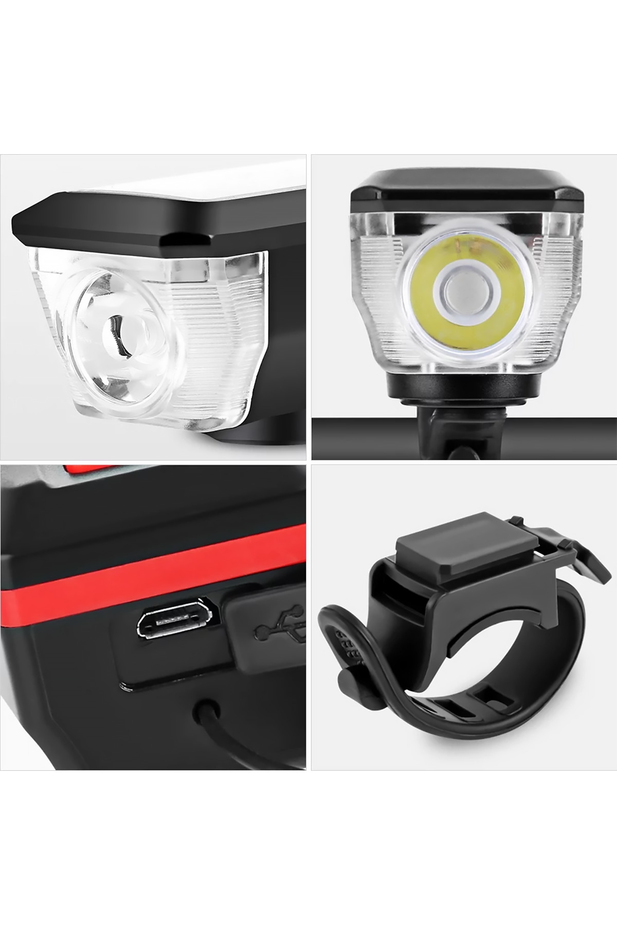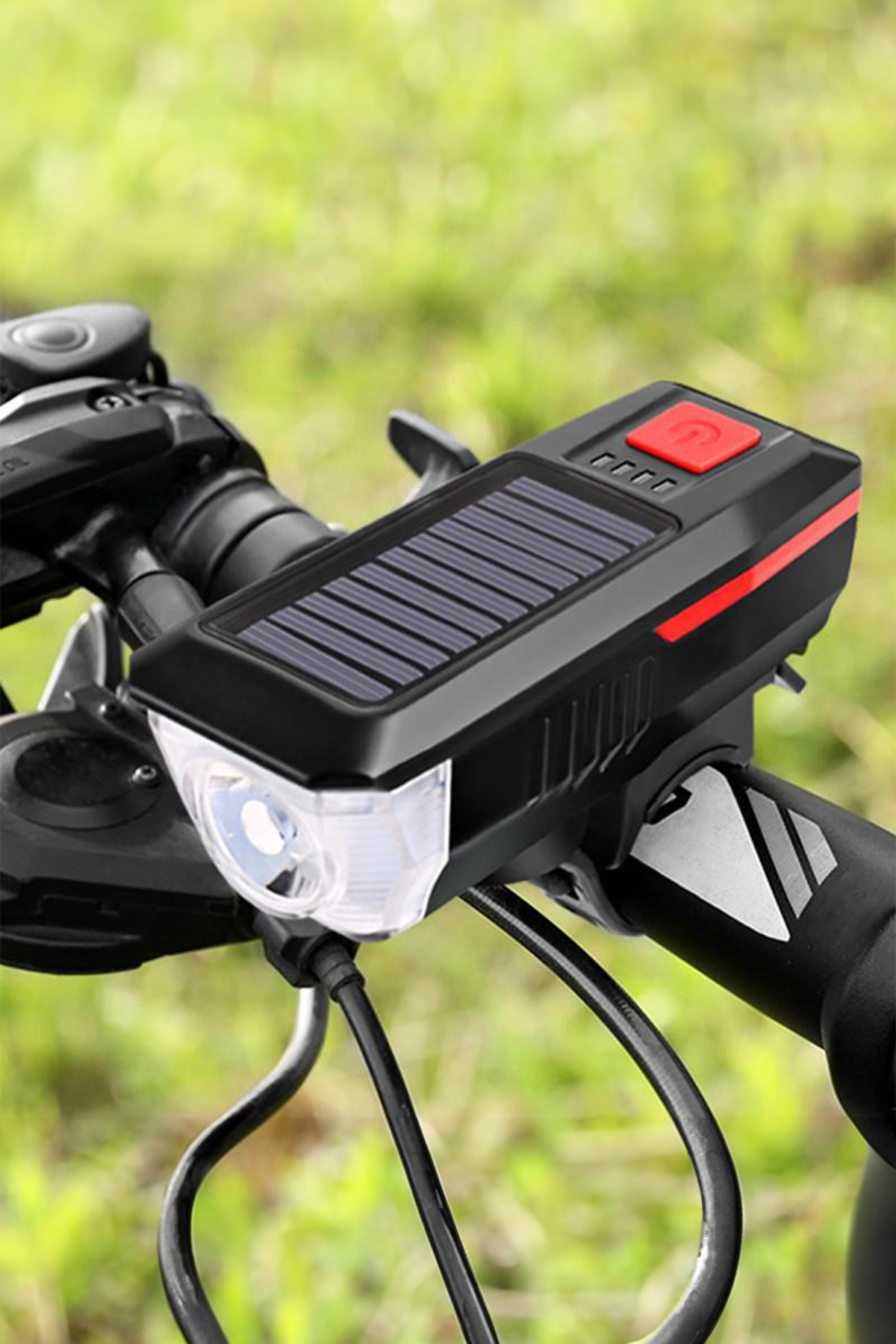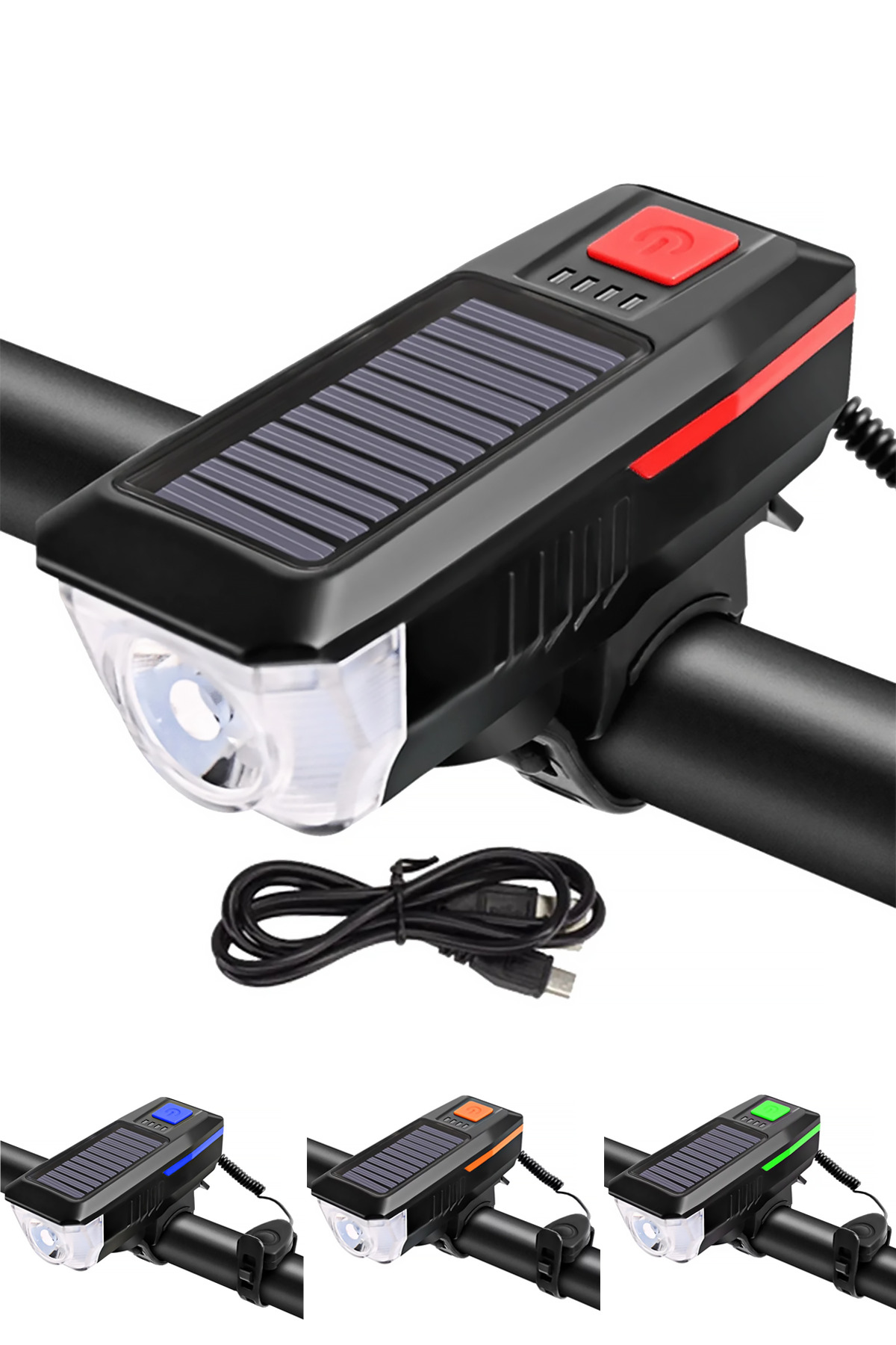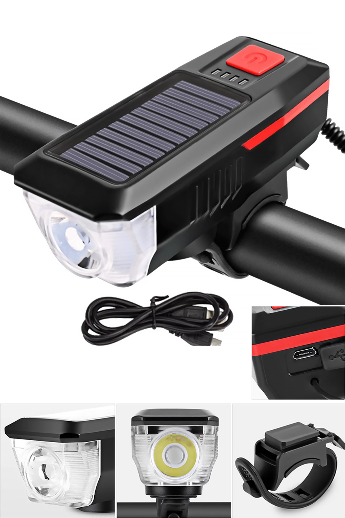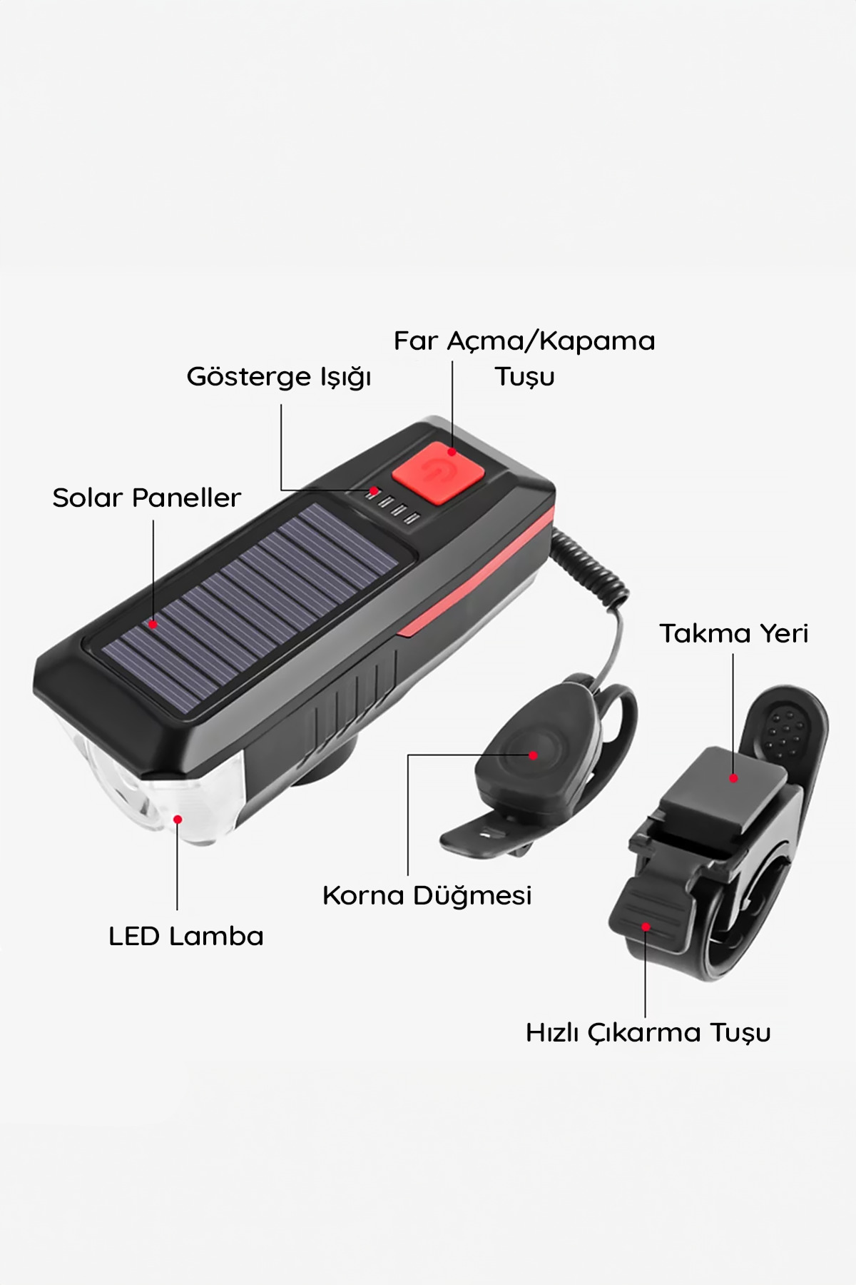 Solar Enerjili USB ile Şarj Edilebilir Ledli Bisiklet Feneri Kornalı ve Su Geçirmez Far Şarj edilebilir ledli bisiklet fenerinin çoklu şarj modu, solar paneller ve USB ile şarj etmenize olanak tanır.