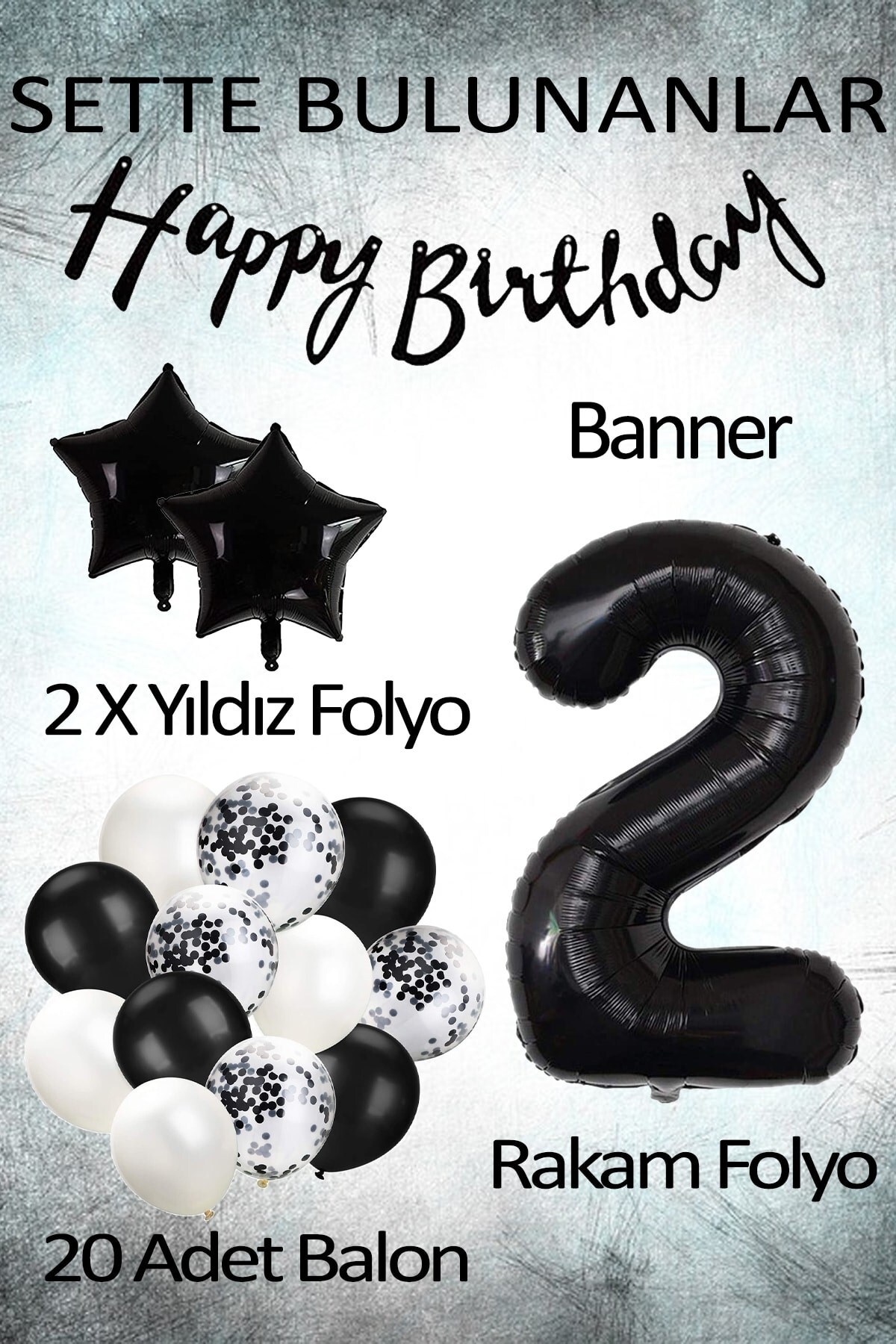 2 yaş doğum günü kutlamalarınız için özel olarak tasarlanmış siyah konsept parti seti, şık ve modern bir görünüm sunar
