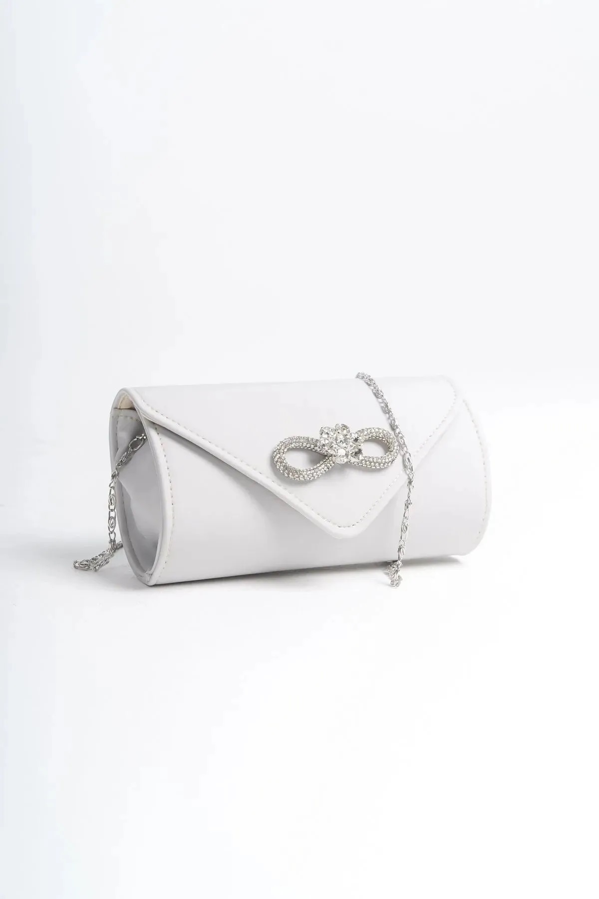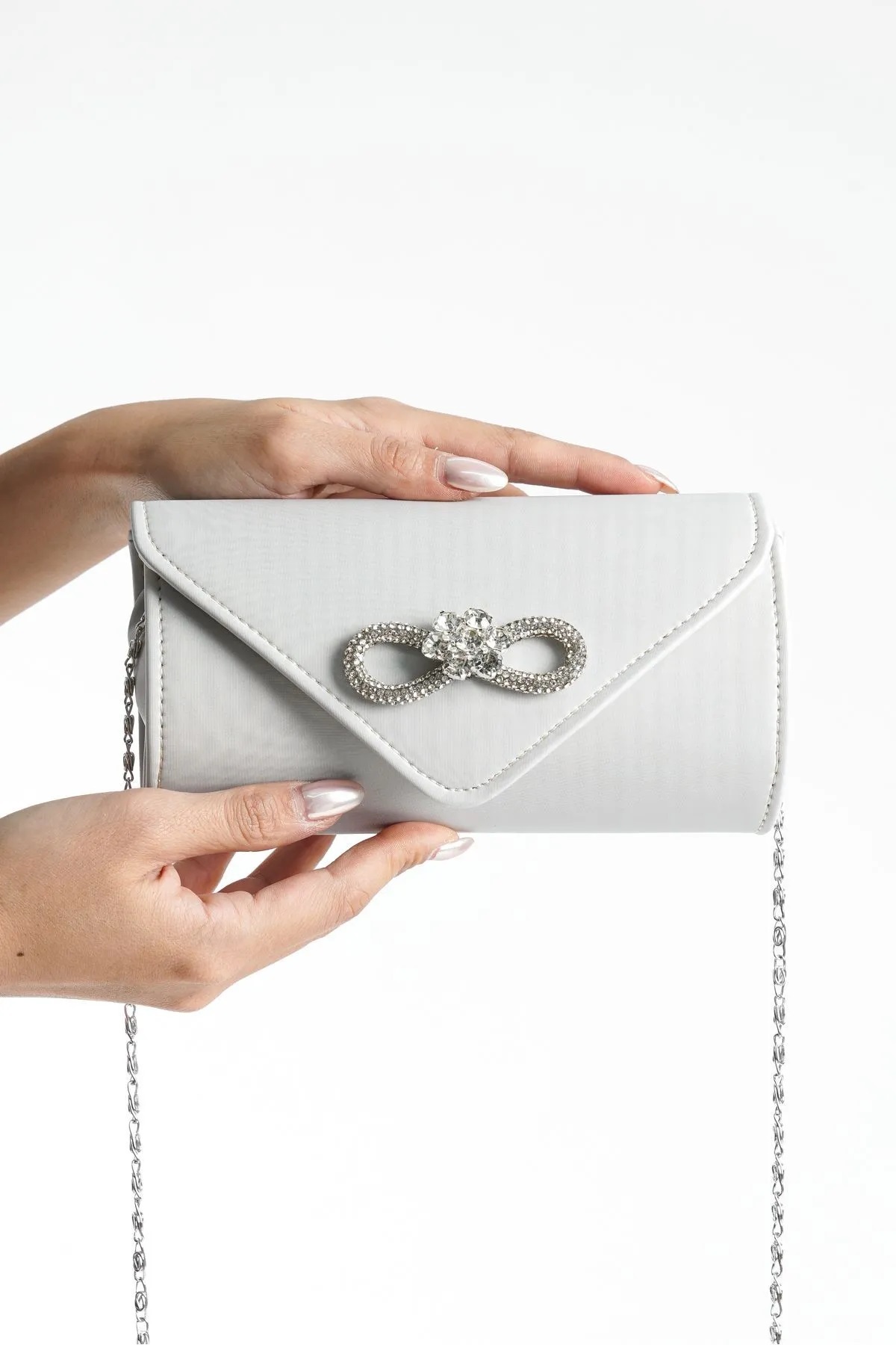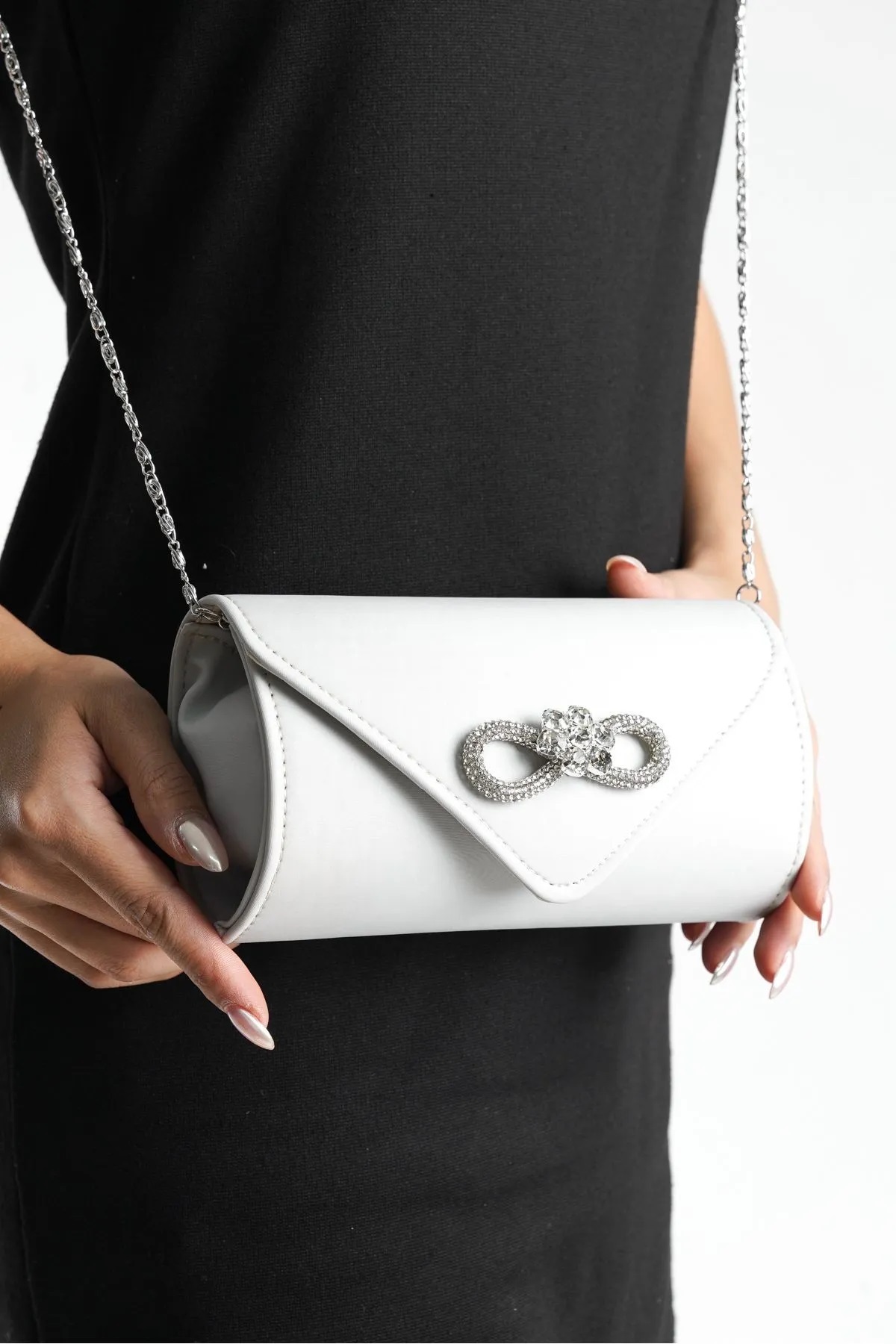 Şık ve zarif tasarımıyla gece davetlerinde göz alıcı bir aksesuar olarak öne çıkan gümüş fiyonk kadın taşlı abiye portföy çanta, her türlü özel etkinlikte şıklığınızı tamamlar