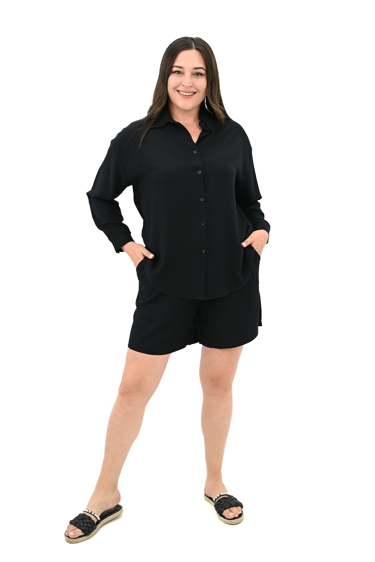 Üst kısmı gömlek yakalı ve uzun kollu olan takımın alt kısmı ise beli lastikli ve bağlama detaylı şort modelindedir.