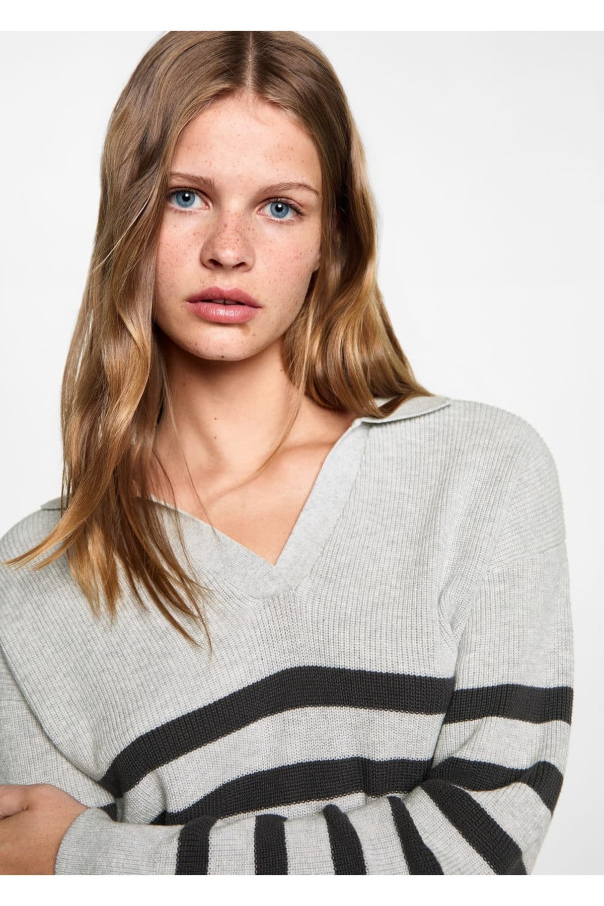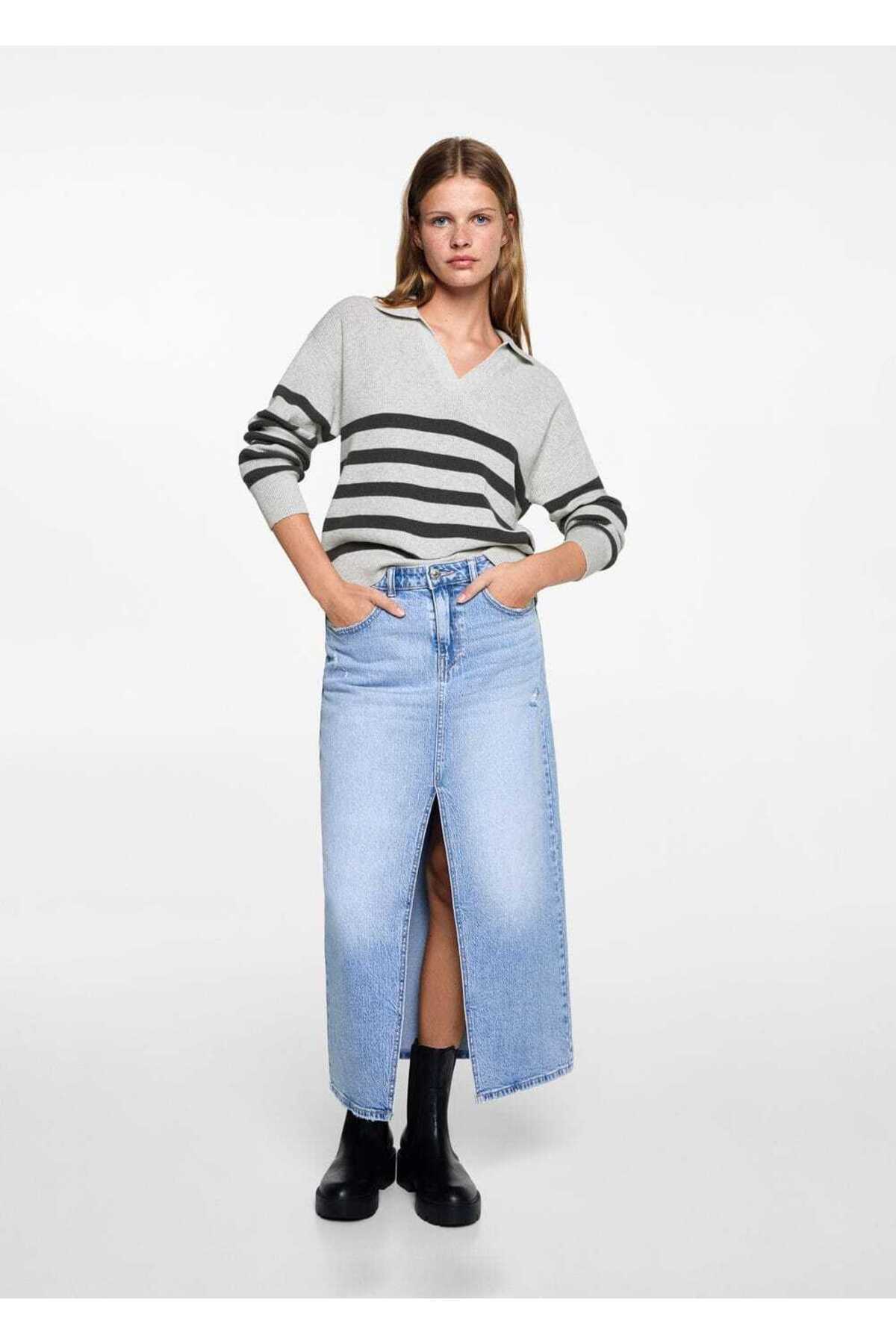 Düz model, Gömlek tarzı V kesim yaka, Uzun model, Uzun kollu, Kapamasız, Back to School, Çizgili tasarım.