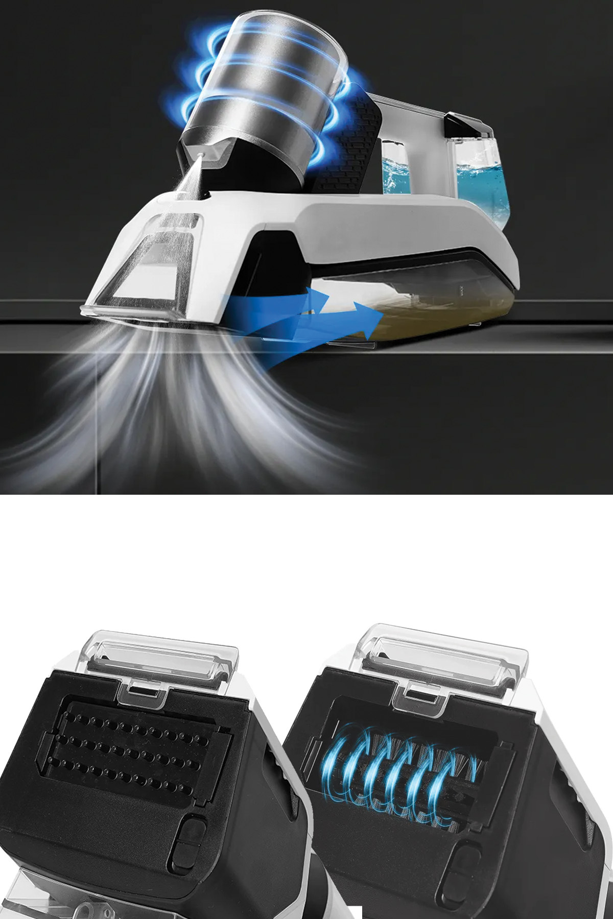 Kanepeler, halılar, kilimler, oto iç mekanları ve döşeme temizligi için idealdir.