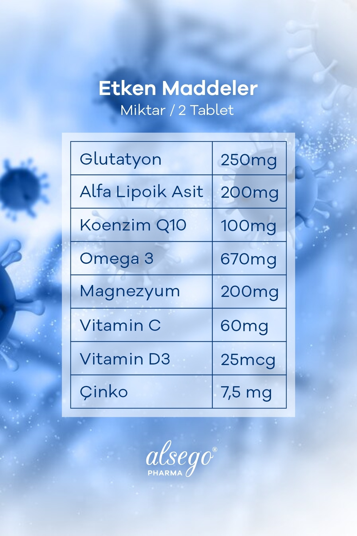 Glutatyon 250mg - Alfa Lipoik Asit 200mg - Koenzim Q10 100mg - Omega 3 670mg - Magnezyum 200mg - Vitamin C 60mg - Vitamin D3 25 mcg - Çinko 7,5mg