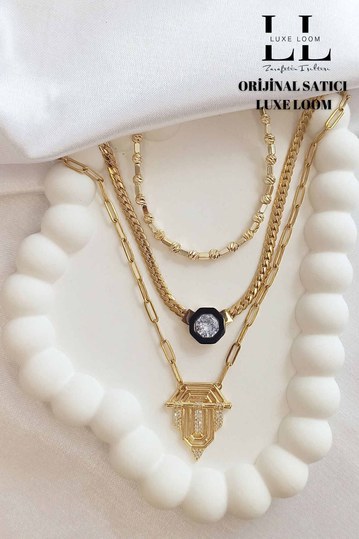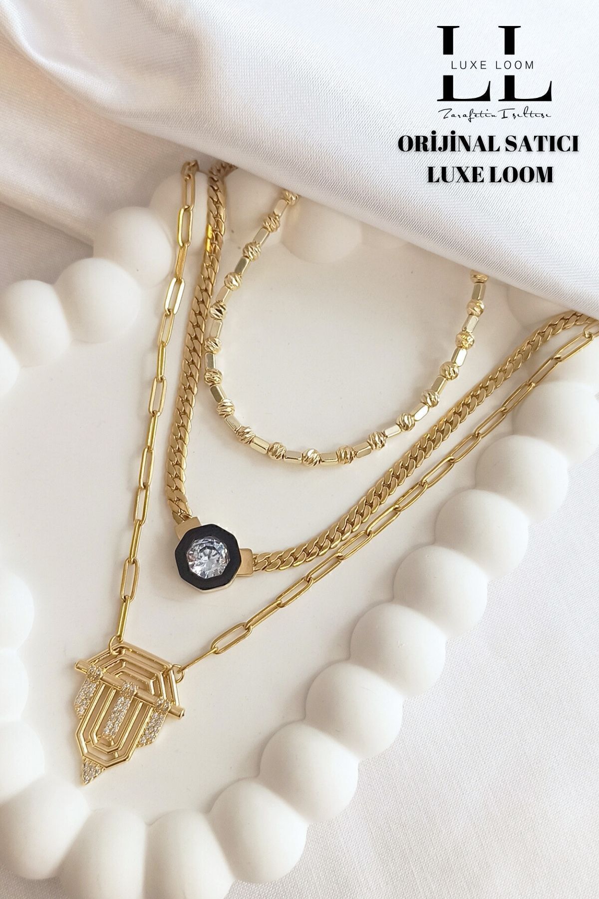 Bu set, üç farklı kolyenin mükemmel uyumunu bir araya getirerek, her kombine farklı bir hava katmanızı sağlıyor.