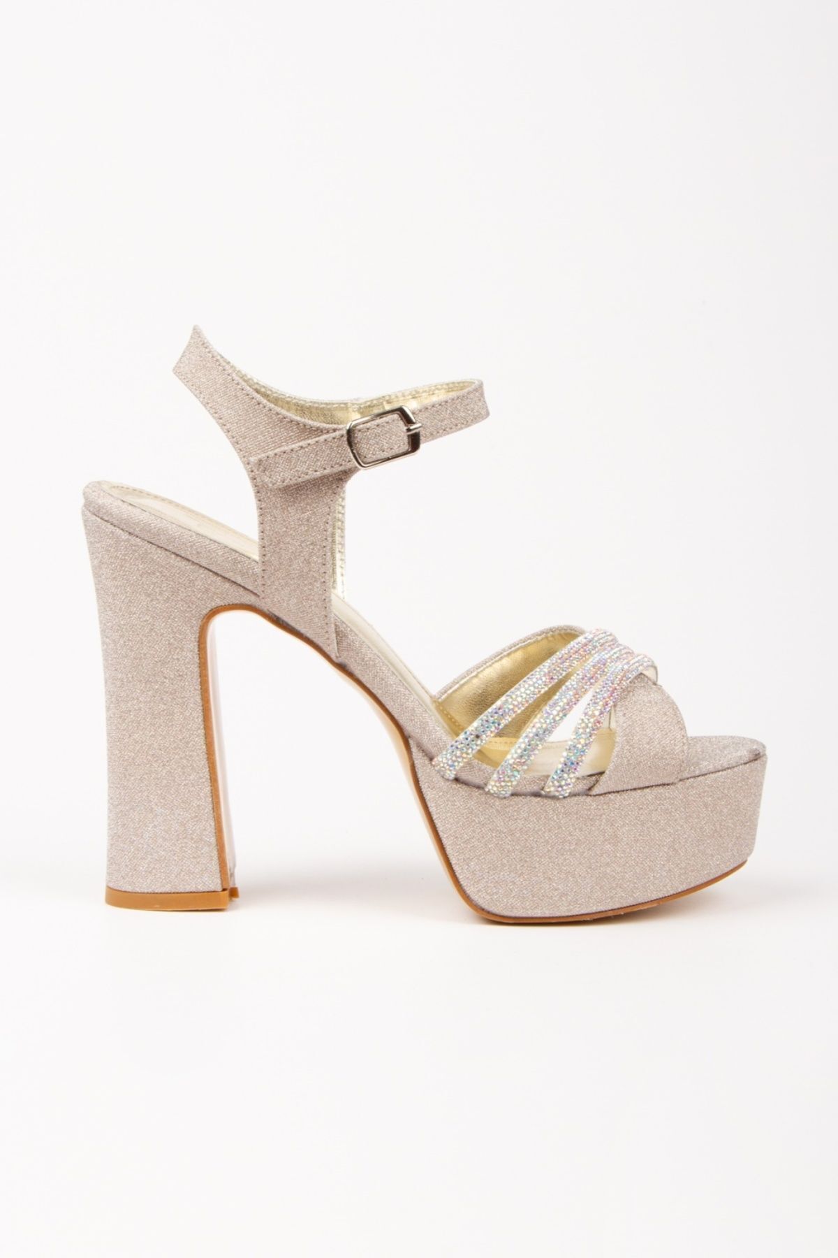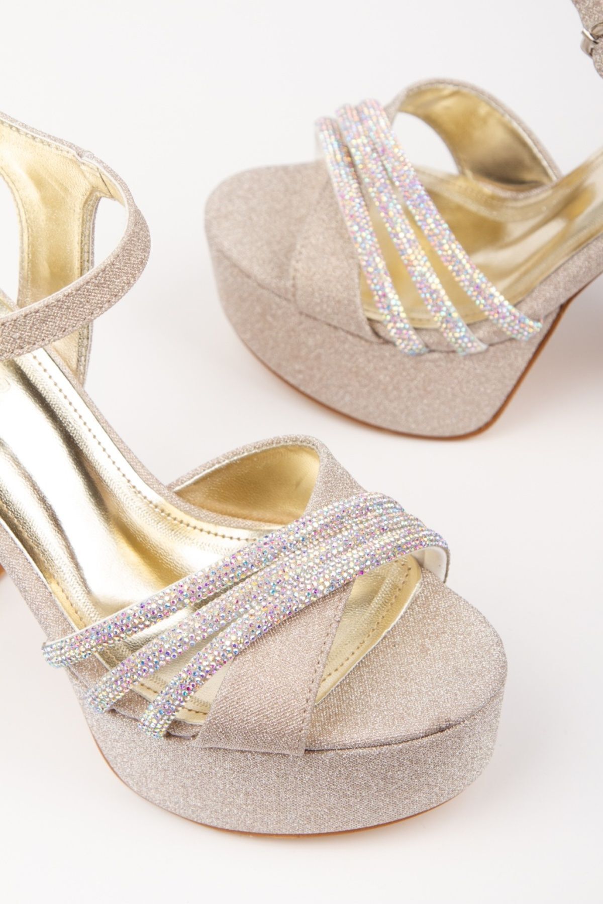 Altın Simli Taş Detay Platform Topuklu Kadın abiye Ayakkabı
