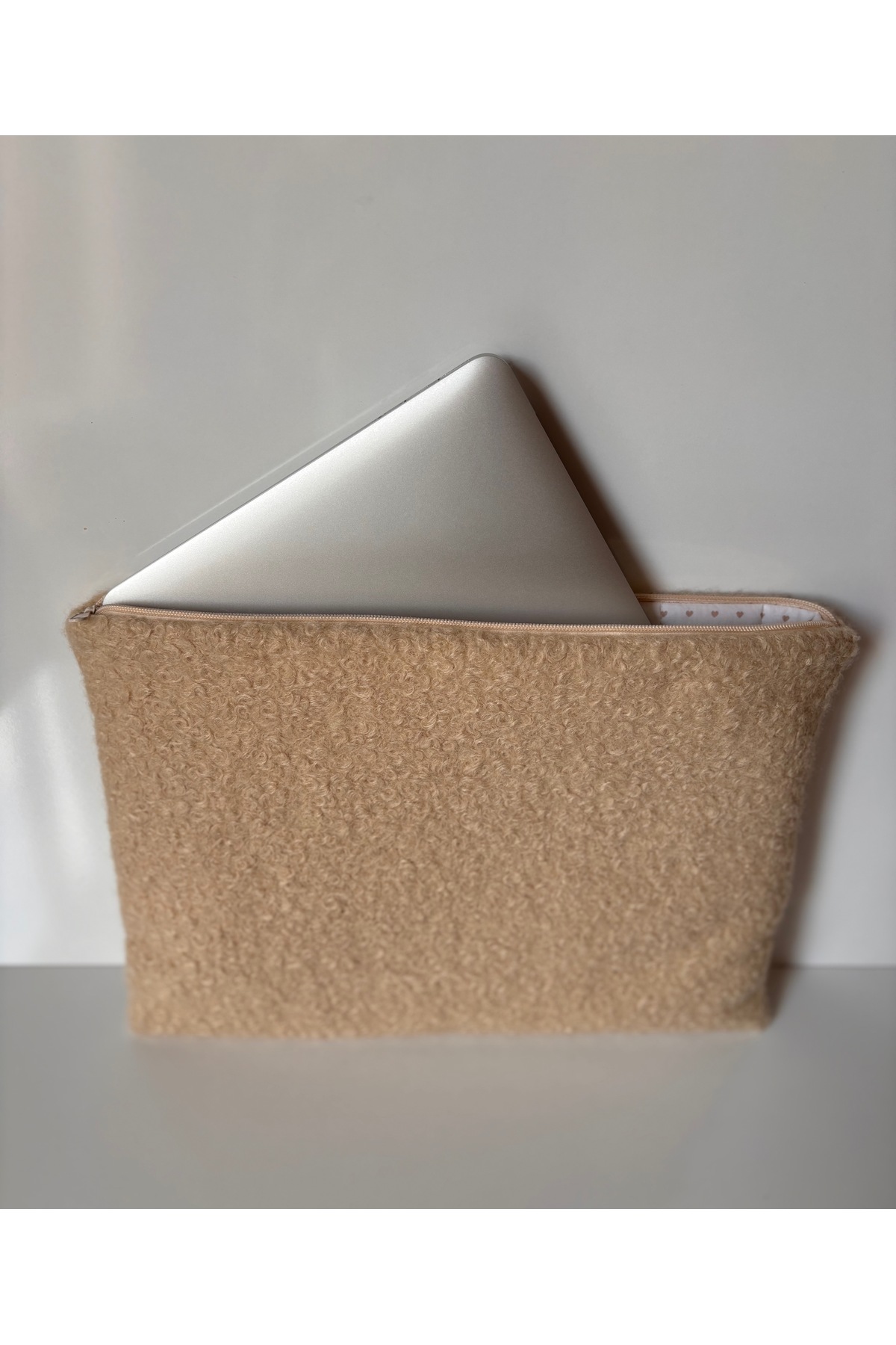 - Ekru rengin zarif tonlarıyla tasarlanmış, her ortama uyum sağlayan kalpli desenli laptop kılıfı.