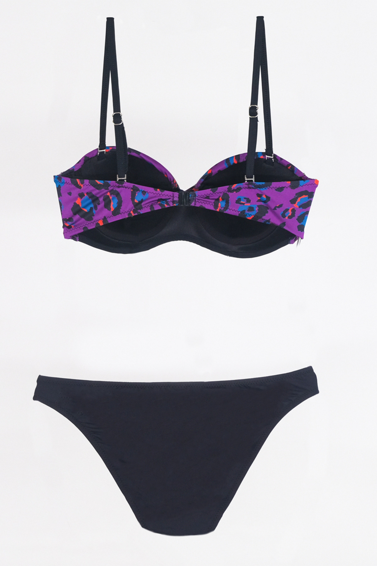 Mor leopar deseniyle göz alıcı bir stil oluşturur ve plaj modasına dinamik bir dokunuş katar