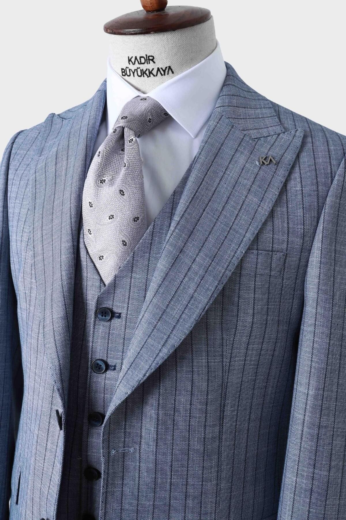 Kadir Büyükkaya imzasını taşıyan bu şık ve rahat yelekli erkek takım elbise, viskon ve likra dokusu ile üretilmiştir.