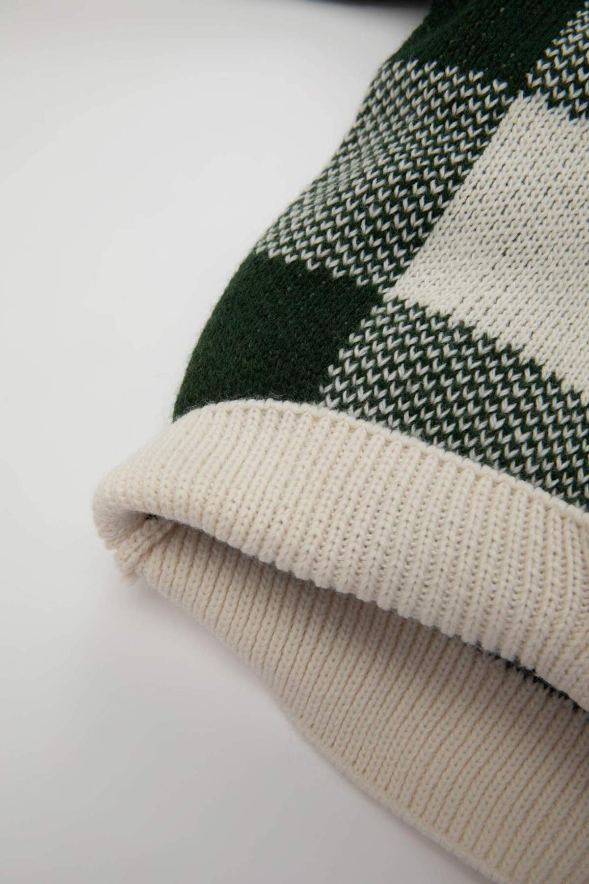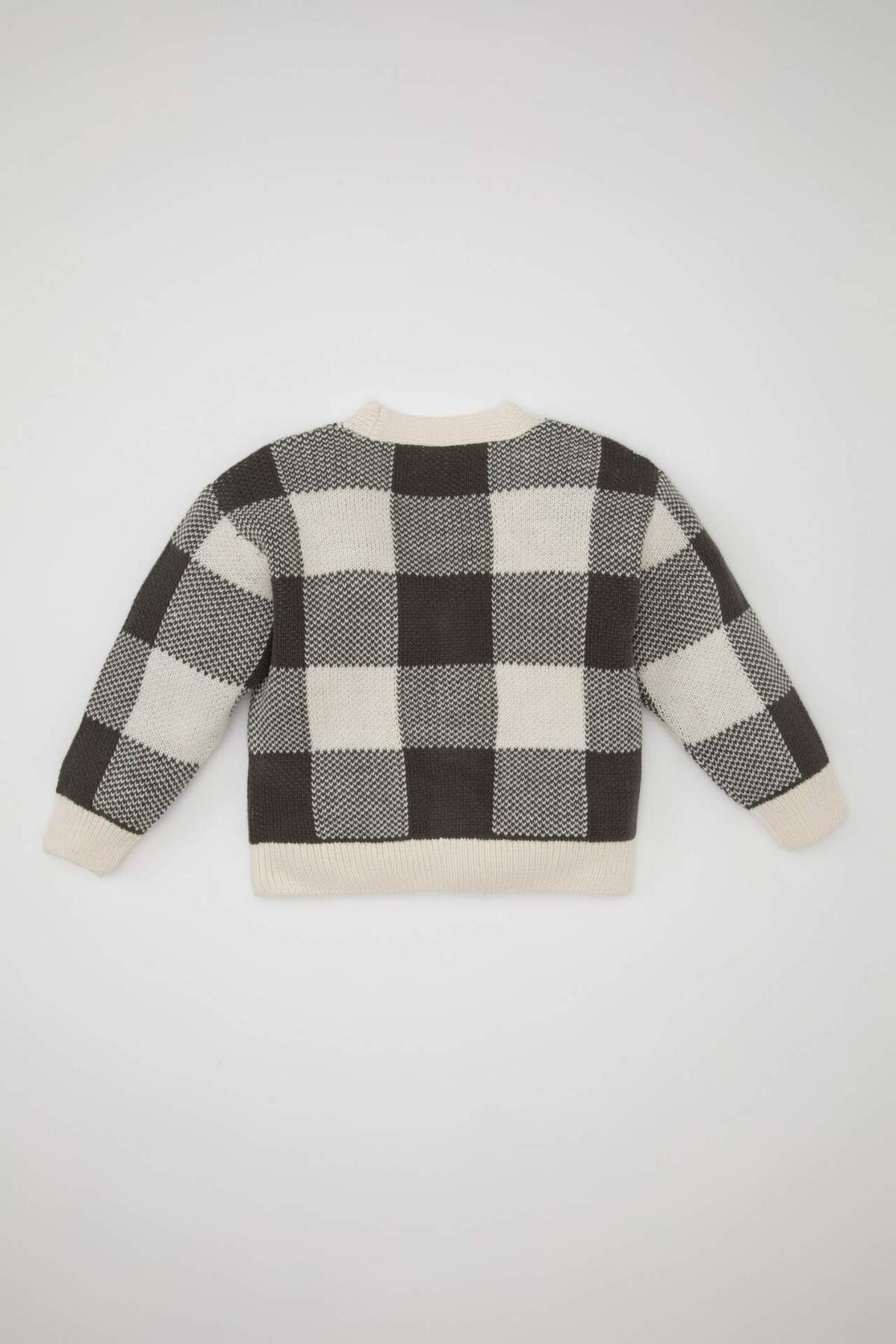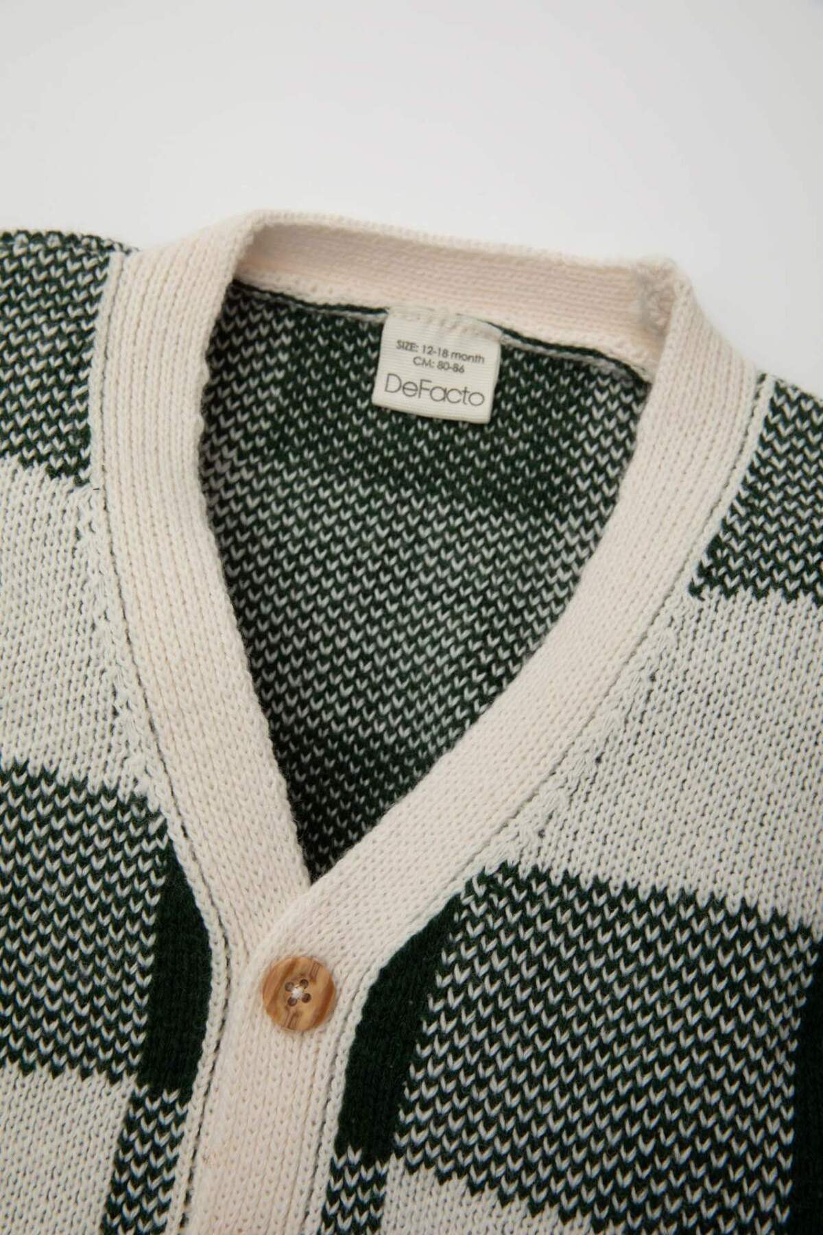 Bebeğinizin şıklığını tamamlayacak bu sevimli V yaka kareli hırka, hem konfor hem de tarz sunar.