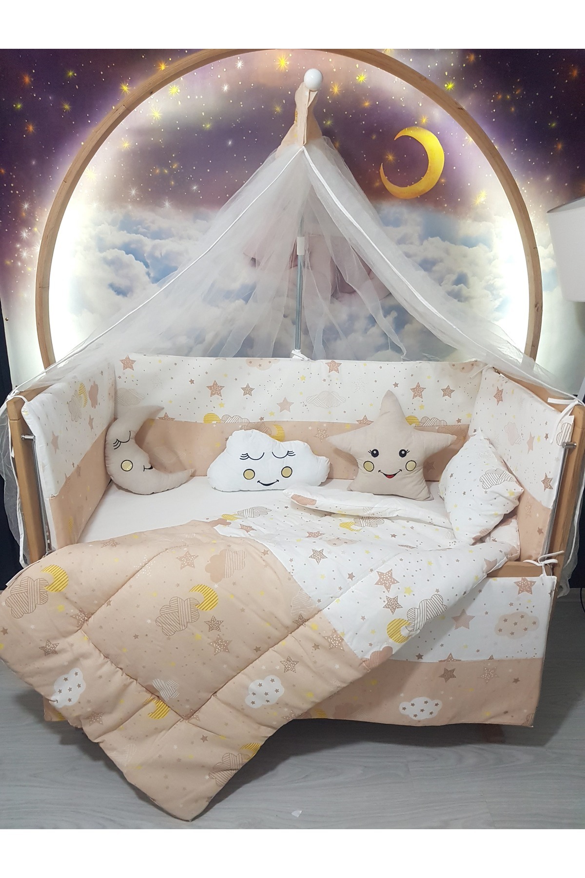 (2 Adet Yan Koruma, Baş Koruma, Ayak Koruma, Yorgan, Yastık, Çarşaf, Ay Bulut Yıldız Uyku Arkadaşları, Cibinlik, Cibinlik Aparatı) Makinede yıkanır, 30°C’de yıkayınız.