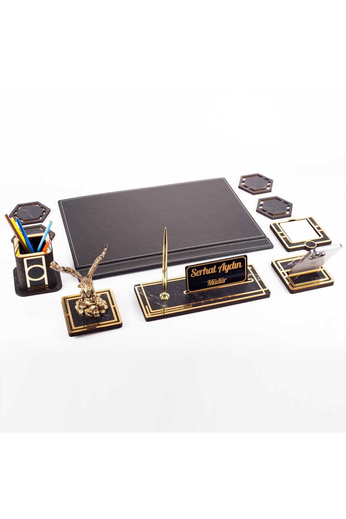 Kartal Biblolu Altın Deri Sümen Takımı Mermer Desen Ahşap İsme Özel Masa İsimliği Masaüstü İsimlik