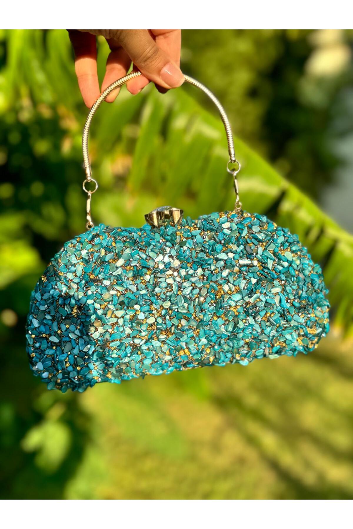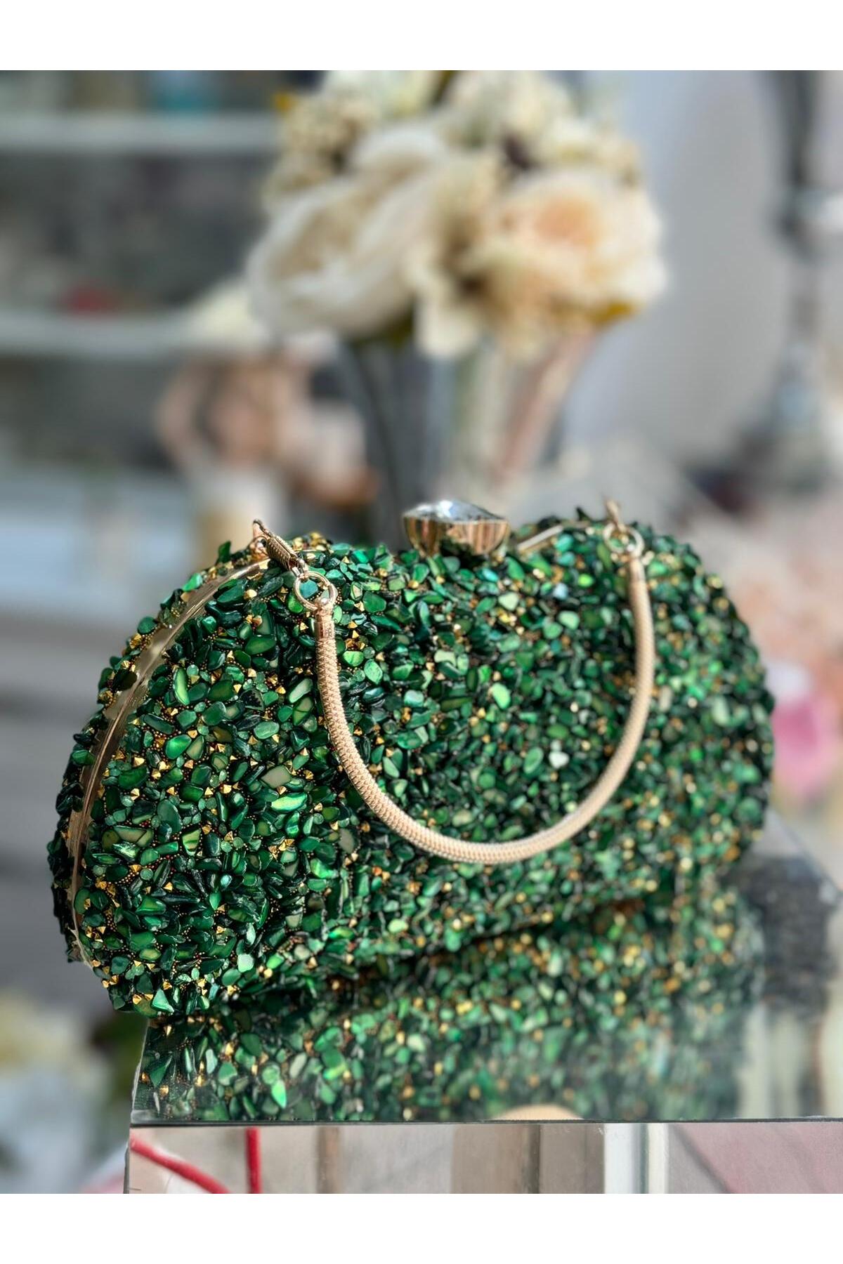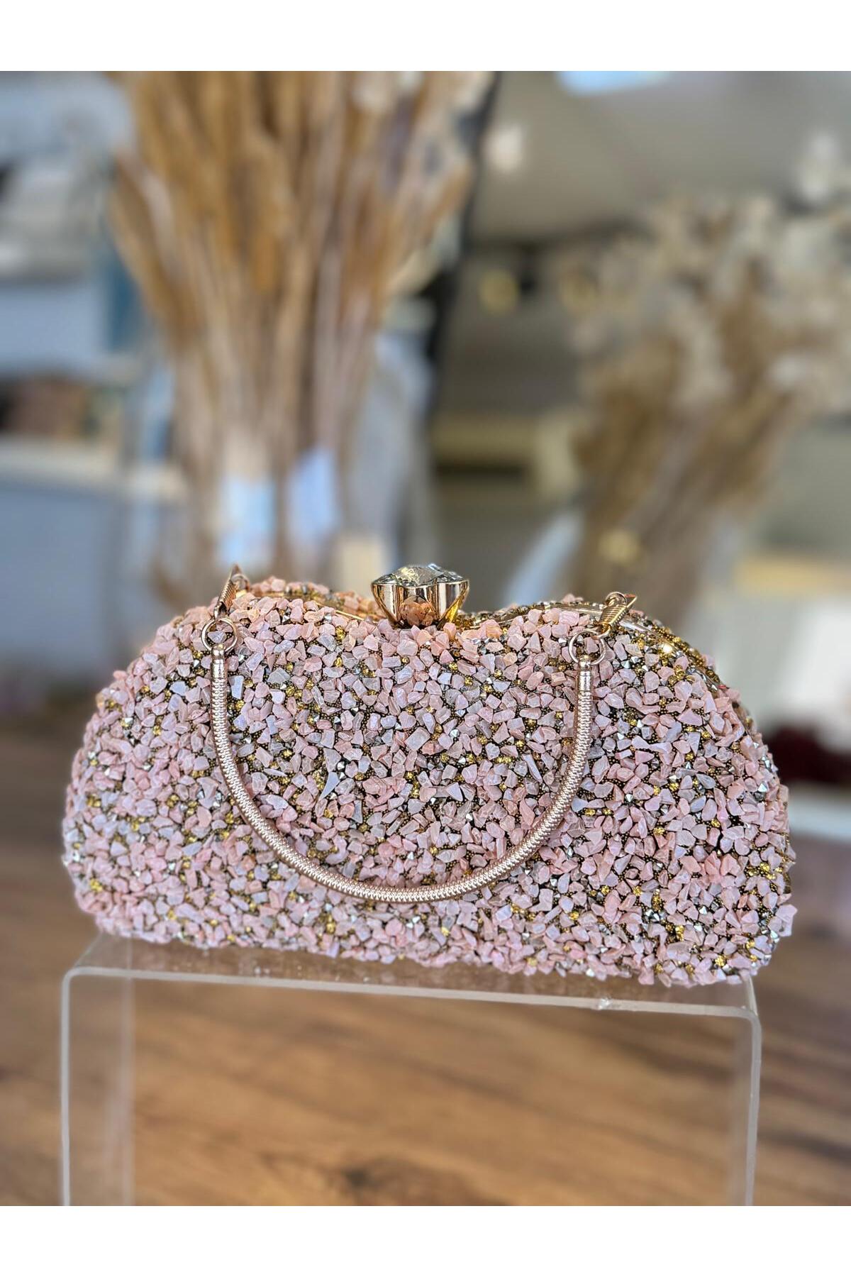 Zarif taş işlemeleriyle göz alıcı bir görünüm sunan bu abiye çanta, şıklığınızı tamamlayacak bir aksesuar