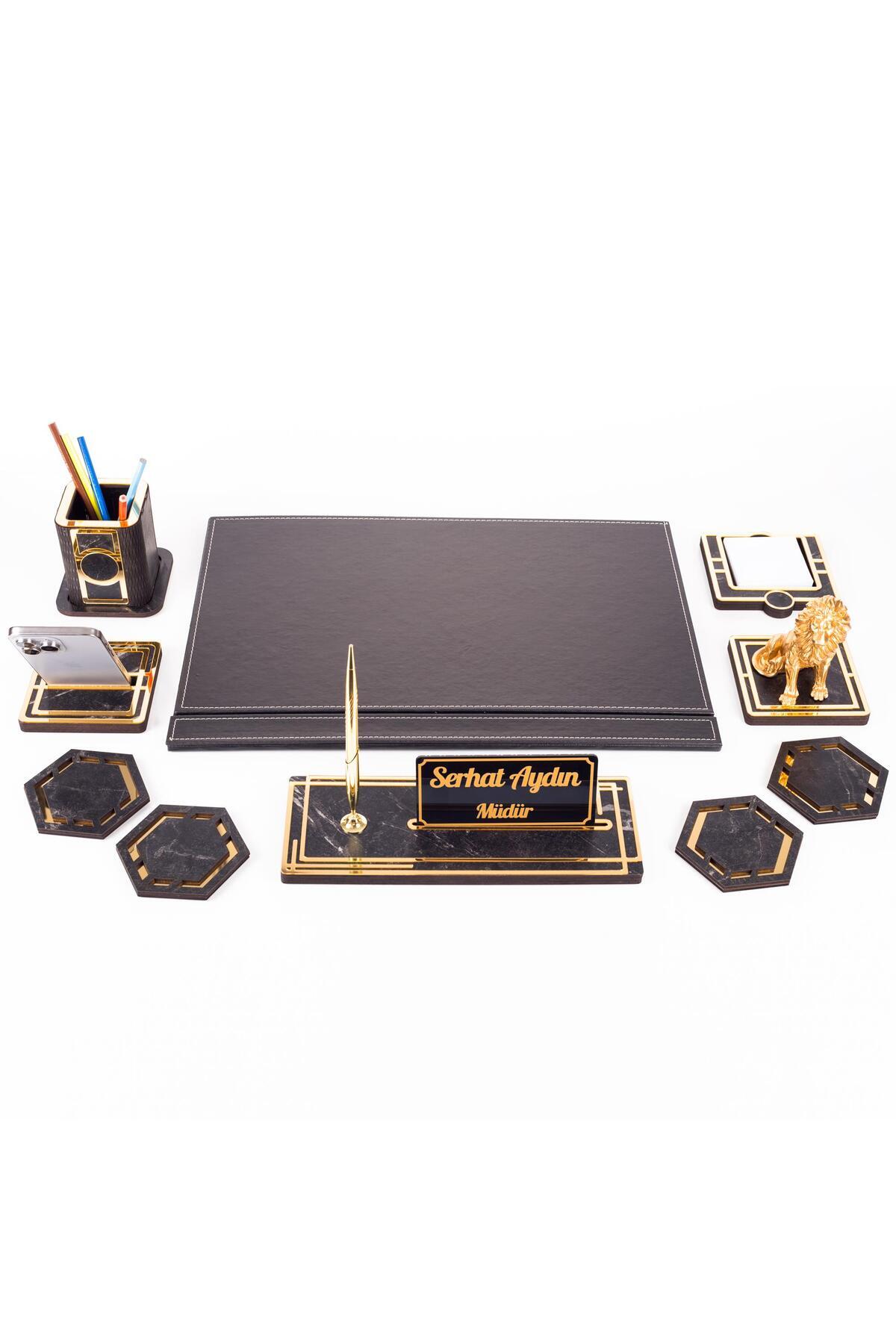 Aslan Biblolu Altın Deri Sümen Takımı Mermer Desen Ahşap İsme Özel Masa İsimliği Masaüstü İsimlik
