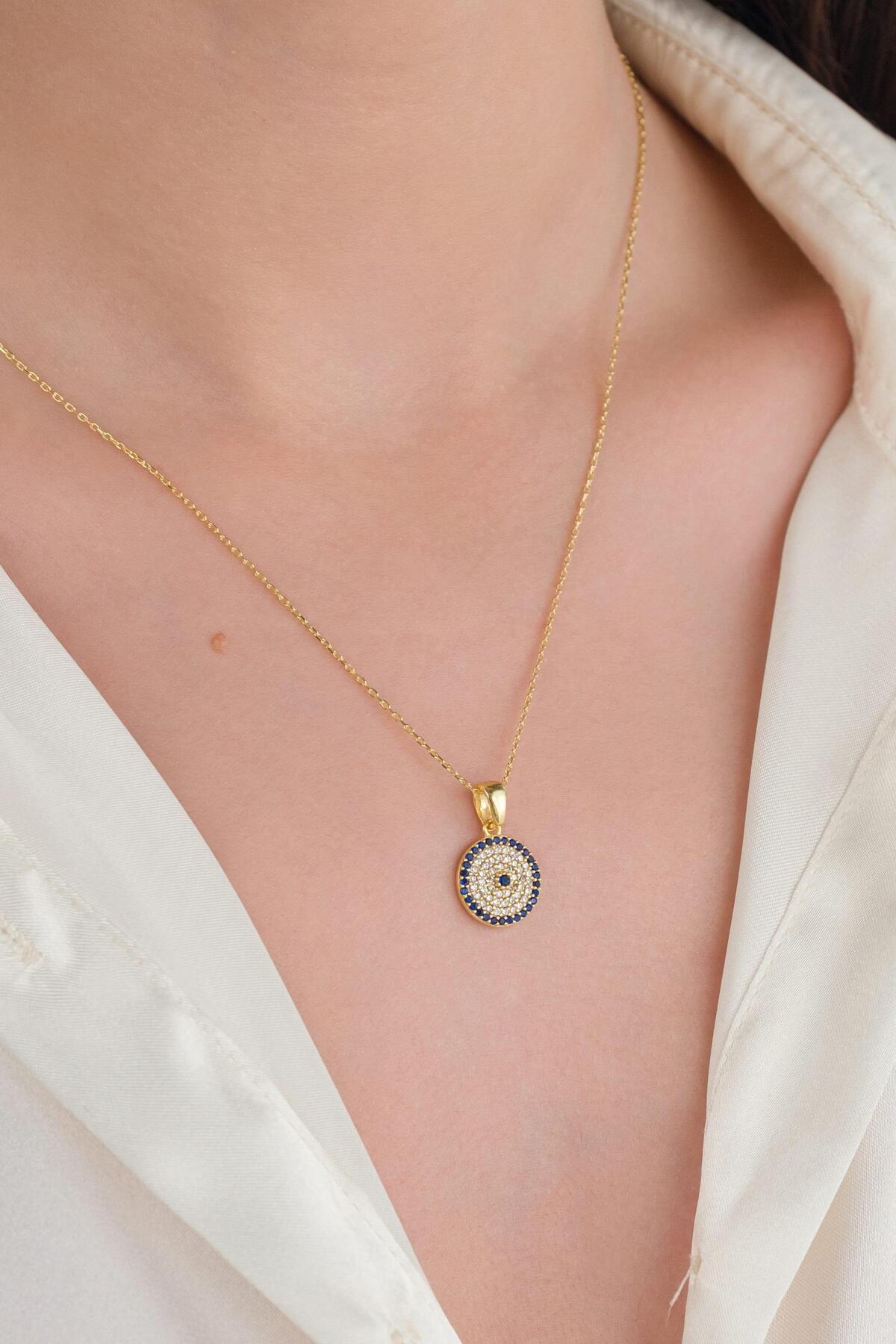 925 AYAR GÜMÜŞ Altın Kaplama NAZAR BONCUKLU ZİRKON TAŞLI MAVİ GÖZ KOLYE AĞIRLIK: 3.25 GRAM NAZARLIK KOLYE UCU BOYUT: 1.2 CM X 1.2 CM (12 MM ) UZUNLUK: 40CM+5CM UZATMA HALKASI TOPLAM UZUNLUK: 45 CM Rodyum Güçlendirmelidir.